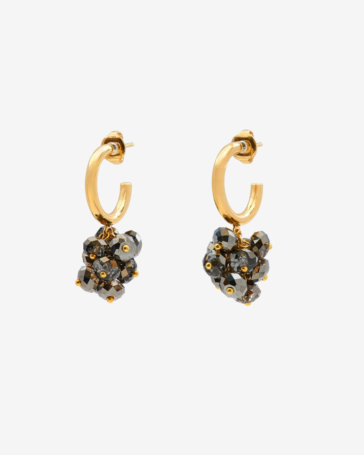 These Polly Earrings by Isabel Marant are beaded hoop earrings in gold-finish brass, adorned with crystal bead pendants. Their semi-open design and intricate detailing make them a perfect accessory for adding a touch of elegance to any look.