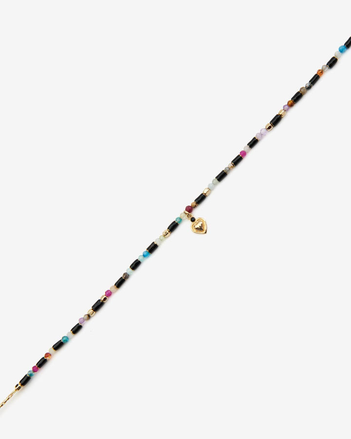 Made from natural stone beads with a gold-finish brass chain and heart-shaped pendant. Features a spring ring clasp and an engraved logo plate.