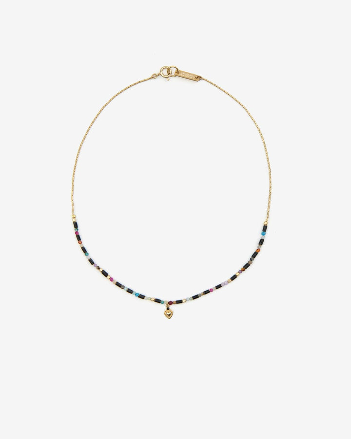 This Alix Choker by Isabel Marant combines natural stone beads with a thin gold-finish brass chain and a heart-shaped pendant. Its delicate design and subtle elegance make it a versatile accessory for layering or wearing solo.