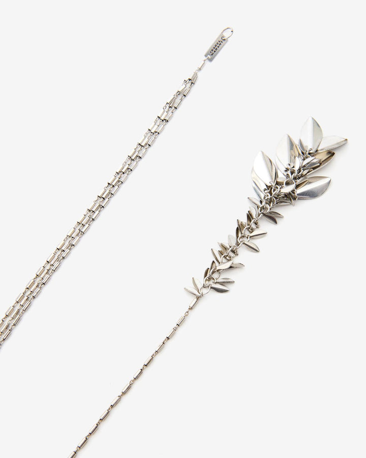 This Freedom Scarf Necklace by Isabel Marant features thin chains with tubular links and leaf-shaped tassel pendants in silver-finish brass. Its delicate design and engraved logo plate make it an elegant accessory for layering or standalone wear.
