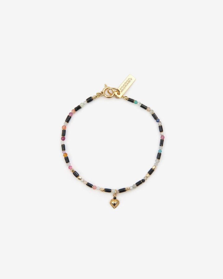 This Alix Bracelet by Isabel Marant is a natural stone bracelet featuring a heart-shaped pendant in gold-finish brass. Its delicate design and engraved logo plate make it a charming and versatile accessory.