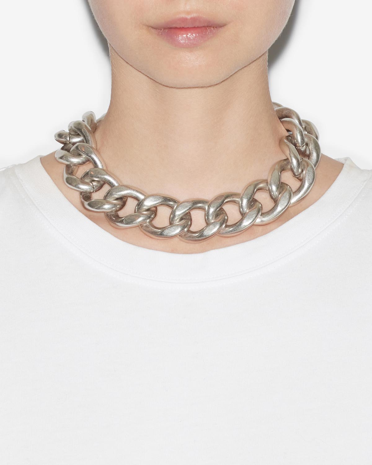 This Links Necklace by Isabel Marant is a bold, oversized chain necklace featuring wide, flat links. The silver-finish gives it a contemporary, polished look, perfect for making a statement. The engraved clasp adds a signature touch to the piece.
