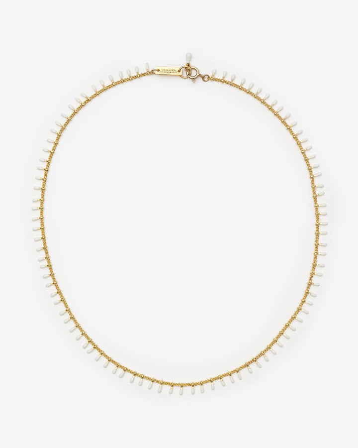 This Casablanca Necklace by Isabel Marant is a tassel-style necklace with a gold-finish brass chain and enameled tassels in contrasting resin. Its striking design adds a bohemian touch to any outfit, making it a versatile statement piece.