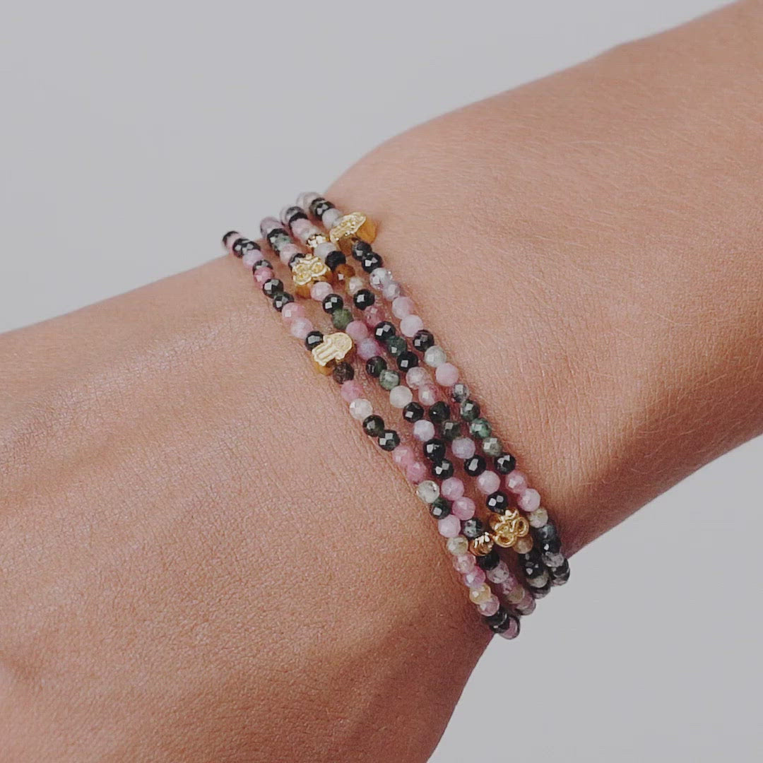 The Universe is your guardian; in its protection, may you find peace. Quintessential values related to well-being are captured in the Tourmaline stone, the key part of our one-of-a-kind Peace and Protection Wrap. This spiritual artisan piece combines the energies of black, brown, pink, and green Tourmaline to bring protection, grounding, joy, and vitality. All the colors of Tourmaline strengthen the mind, body, and spirit connection. Additionally, the Hamsa and OM charms will elevate your consciousness to understand the transcendent harmony between all things.