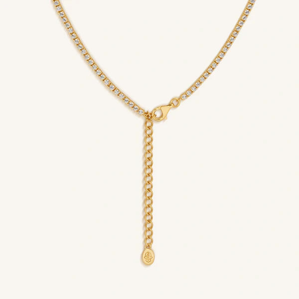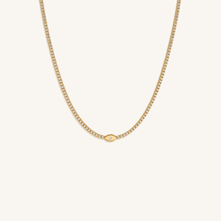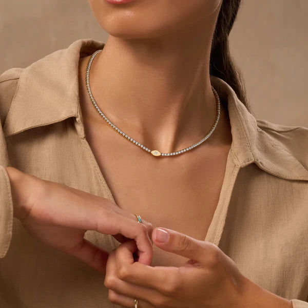 Remembering gratitude while walking with the gentle ebb and flow of life will bring your blessings back to you exponentially. The intuitive powers of the Evil Eye symbol help add a level of mental security and peace as you move toward your highest self. This necklace graces your neck with a refined elegance while warding off negativity. The “Gracefully Abundant Evil Eye Tennis Necklace” adds a touch of glamor with 18K Gold-plated Silver and Brass and 2mm Cubic Zirconia. Wear this necklace for added protection and peace.