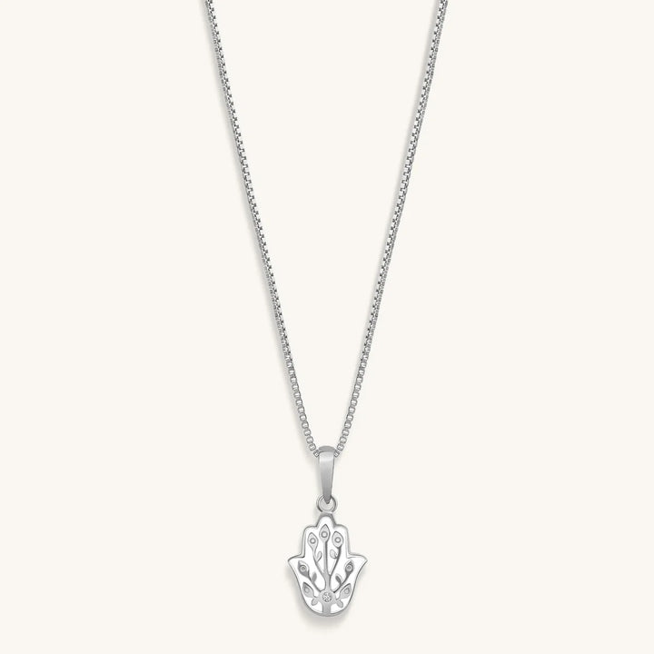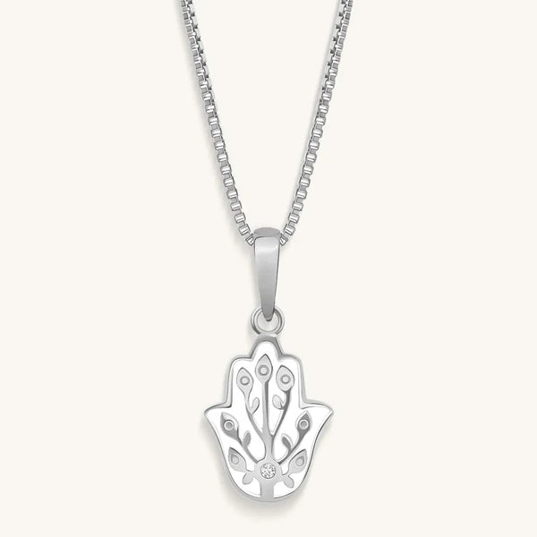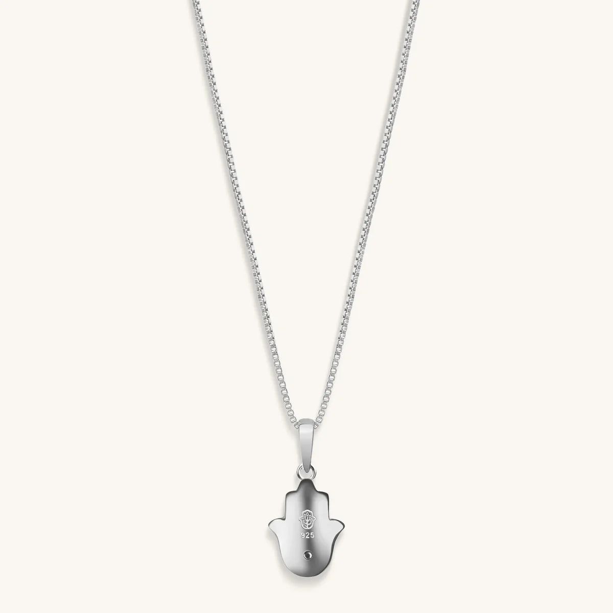 10 x 12 mm Hamsa Charm: ProtectionWhite Enamel1.25 mm Embedded Diamond ChipRhodium Plated 925 Sterling SilverLobster Clasp ClosureChain Length: 18'Culture: Handmade in Bangkok, Thailand