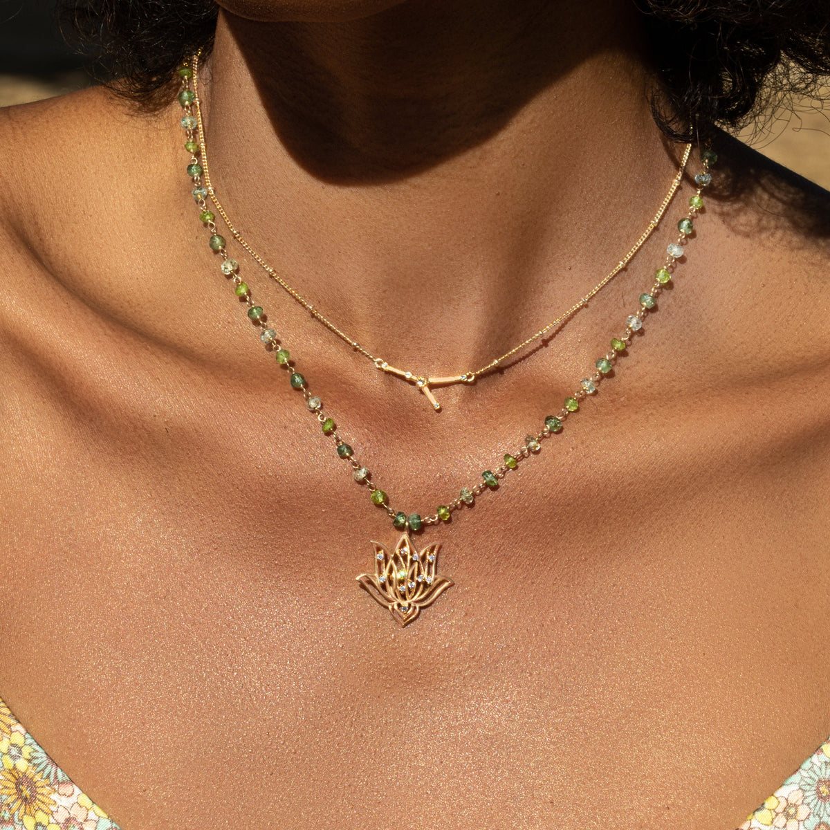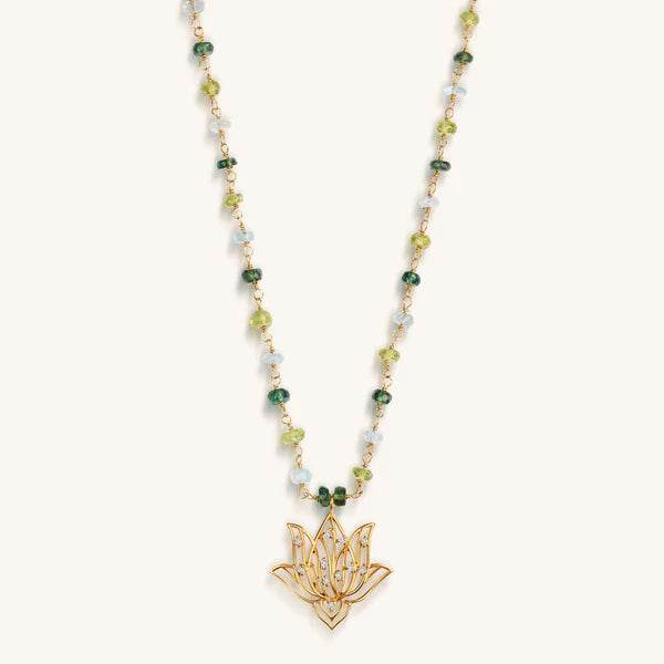 18 mm Lotus Charm: enlightenment, new beginnings, fertility4 mm Peridot Stones: joy, divine connection, concentration, stone amplifier4 mm Aquamarine Stones: tranquility, fluidity, soothing4 mm Apatite Stones: spiritual wisdom, communication, personal powerCZ Crystals18K Gold Plated Brass NecklaceLobster Claw ClosureLength: 15' to 18'Culture: handmade in Jaipur, India