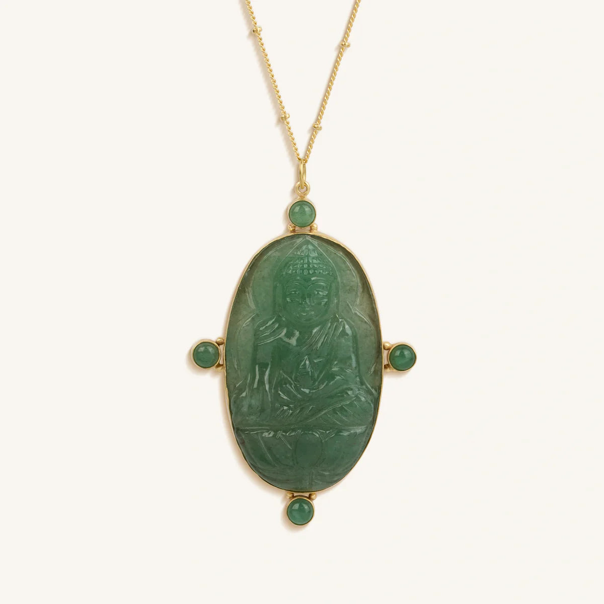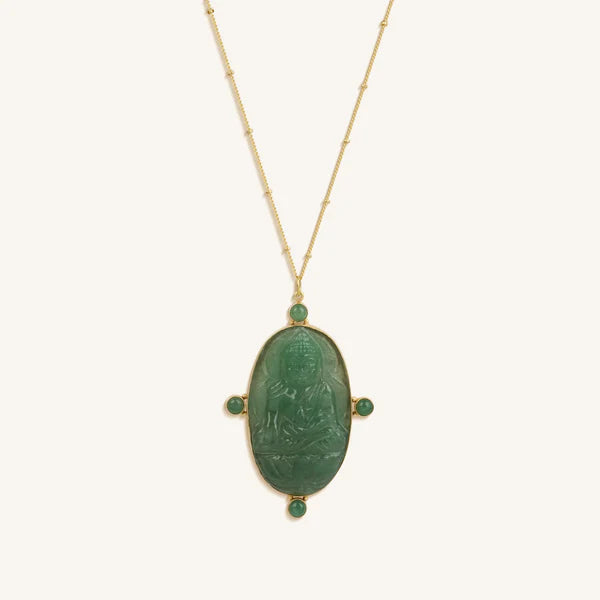 When your soul is at peace, you will notice positivity and opportunities waiting for you around every corner. Increase your karmic favor with our “Constant Blessings Aventurine and Jade Pendant Necklace”. The eye-catching Jade and Aventurine pendant brings added tranquility and confidence to your day while sitting on an 18K Gold-Plated Brass ball chain. For an unforgettable statement piece that will add elegance to your collection, bring home this stunning necklace.