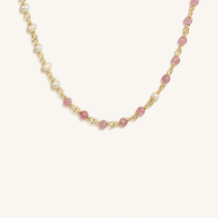 Life is a continuous journey to reach your highest energetic vibration, walking with love and intention brings endless possibilities. Let the blessings rain down with our “Exuberant Celebration Pearl and Pink Tourmaline Necklace”. This stunning combination of Pearls and Pink Tourmaline offer soothing vibes and balancing effects, all set on an 18K Gold-Plated Brass chain. For a pop of delicate colors and shining gemstones, bring home this gorgeous necklace.