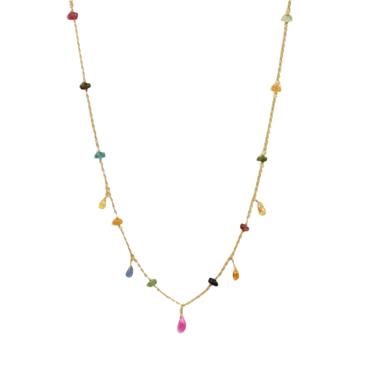 A delicate dance of Tourmaline, Amethyst, Garnet, Peridot, and Blue Topaz encircles you while balancing on an 18K Gold-Plated Brass chain. The peaceful energy of Tourmaline, Amethyst, and Peridot mixes with the vitality of Garnet and Blue Topaz in an elegant orchestra of shimmering colors and intentions. This “Vibrant Soul Multi-Stone Necklace” adds a sophisticated touch to your look while the gemstones offer soothing and balancing energies. Treat your favorite person with this iconic necklace.