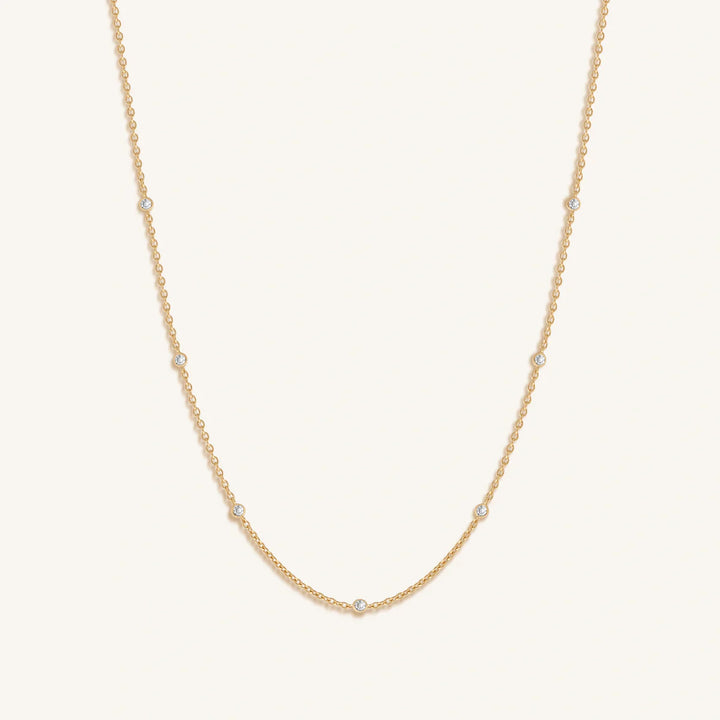By stoking your own fire, you have more warmth and love to share with others. Plated in 18K Gold, this delicate chain necklace is dotted with seven sparkling CZ Crystals. Worn alone or layered with other chains and charms from our collection, this staple jewelry piece illuminates the path before you. Secure the “Starry Skies CZ Crystal Gold Necklace”, using the Lobster Clasp, to shine as brightly as the nighttime constellations.