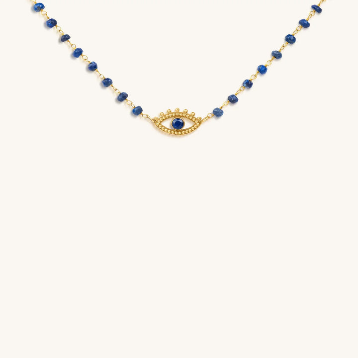 4 mm Lapis Lazuli Stones: Insight, Intuition, Harmony12 mm Evil Eye Charm: Protection, Awareness, Intuition18K Gold Plated Brass16'-18' LengthLobster Clasp ClosureHandmade in India