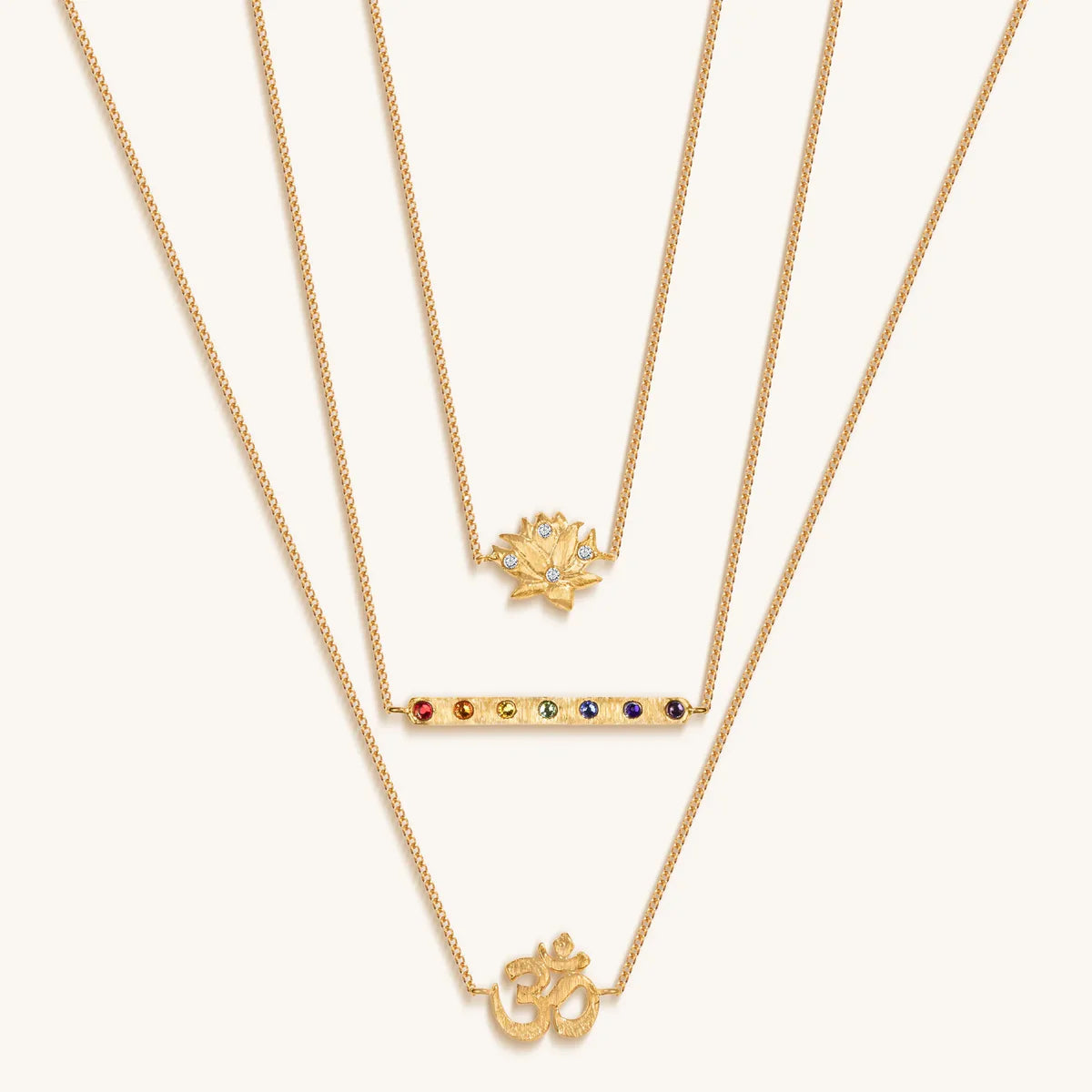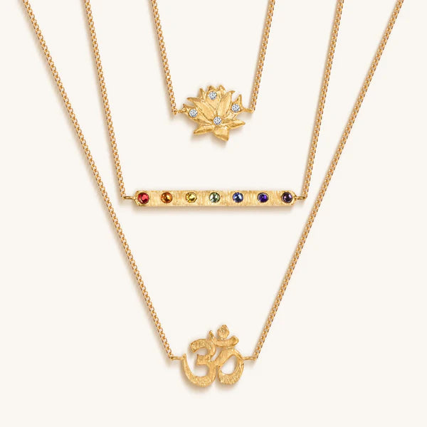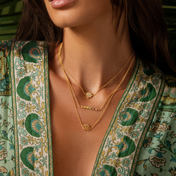 Lotus Charm: enlightenment, new beginnings, fertility.OM Charm: serenityChakra Bar: balance, creativity, wisdom, strength18K Gold Plated BrassTriple Layer NecklaceLength: 15'/17'/20'Culture: handmade in Bali