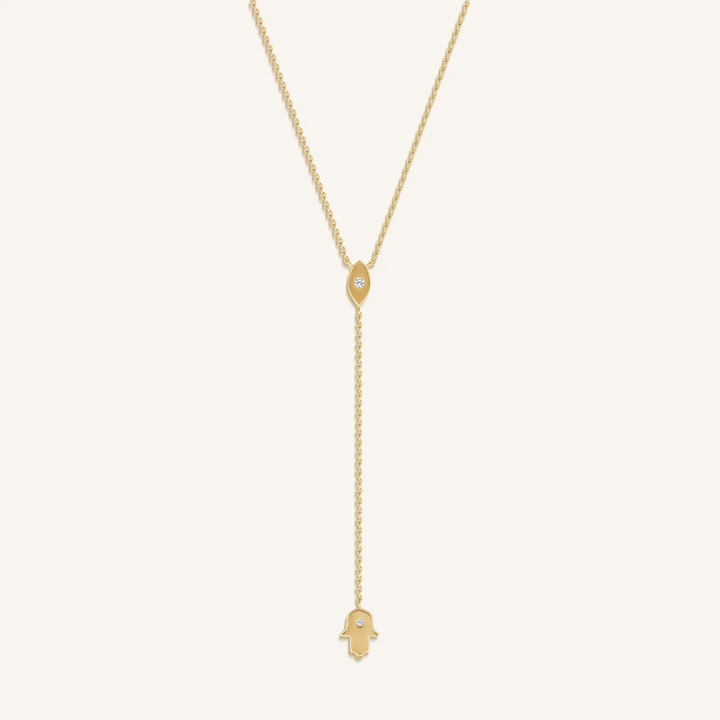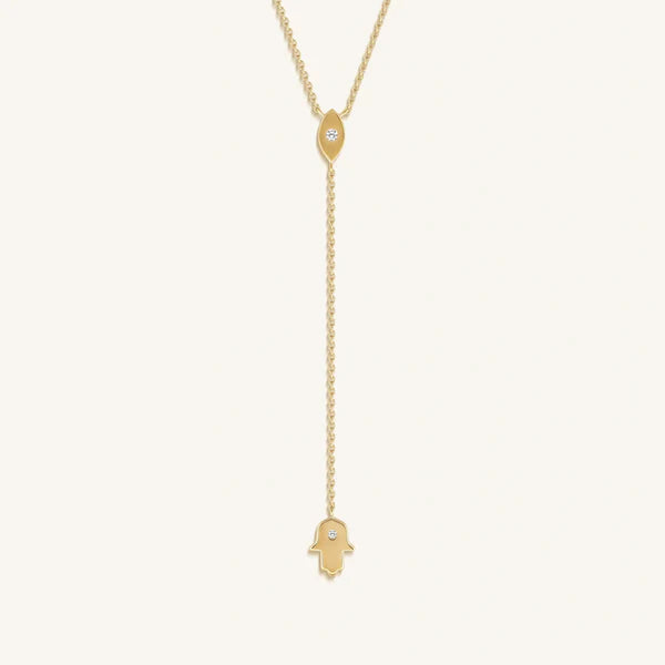 Abundance multiplies when you are generous with the blessings you receive. Designed with gleaming 18K Gold-Plated Silver, this lariat-style necklace features two sacred symbols. Both amulets of protection and peace, the Hamsa Hand and the Evil Eye are embellished with sparkling CZ Crystals. The Hamsa Hand stabilizes emotions and promotes serenity, while the Evil Eye heightens your awareness and boosts intuition. Wear the “Gracious Guardian Gold Evil Eye & Hamsa Necklace” to live boldly and brilliantly.