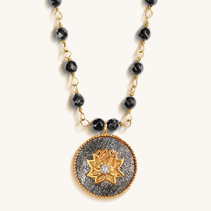 Black Rhodium Plate Lotus Pendant: enlightenment, new beginnings, fertility. Hematite Stones: calming, grounding, focus, centering.18K Gold Plated BrassLength: 16'Pendant NecklaceCulture: handmade in Jaipur