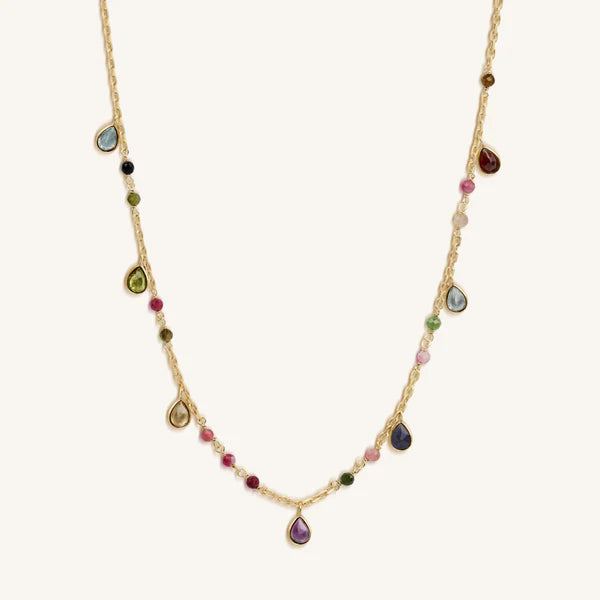 Showing grace to those around you reflects the elegance of your spirit. Let your inner glow shine outwards with “Graceful Delight Sapphire and Tourmaline Necklace”. Set on an 18K Gold-Plated Brass chain with shimmering multi-color Sapphire and Tourmaline gemstones that pop with a rainbow of colors. The peaceful energy of Tourmaline with the intuitive nature of Sapphire makes this a great necklace for the nurturing people in your life.