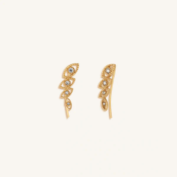 Sync yourself to the rhythm of the universe, blissfully dancing through the ups and downs. Showcasing the sacred energy of the Evil Eye, these 18K Gold Plated “Expanded Awareness Evil Eye Climber Earrings” provide powerful protection, enhanced insight, and heightened awareness. Embellished with sparkling CZ Crystals, the four Evil Eyes on each ear keep 24/7 watch over you and your surroundings. Allow this omniscient symbol to charge your life with positivity and peace.