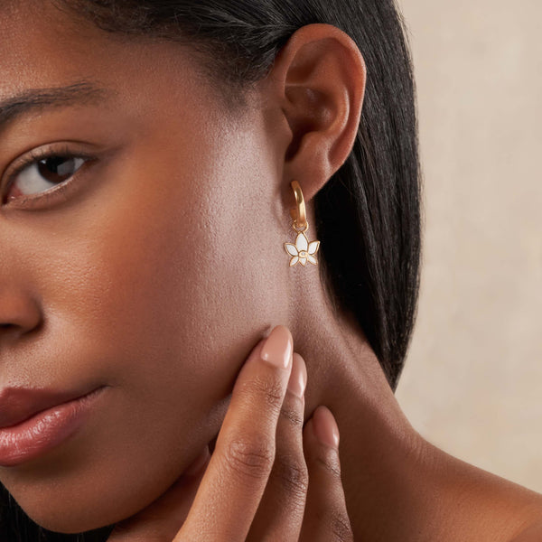 The Lotus embodies resilience and grace, with beauty that endures even the greatest hardships. Our designers have captured this iconic flower in white enamel charm with a sparkling crystal core, which will cleanse and purify your vibrations for lasting bliss. The Unending Grace earring charm can be fastened to an earring from our Build Your Own Karma collection for a personalized statement.