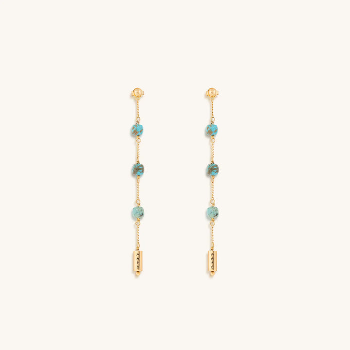 5 mm Square Turquoise Stones: Healing, Balance, Prosperity.4 x 8 mm Mantra Barrels: Protection, Meditation, Tranquility, Serenity18K Gold Plated BrassDangle EarringsLength: 8 cmCulture: Handmade in Bali, Indonesia