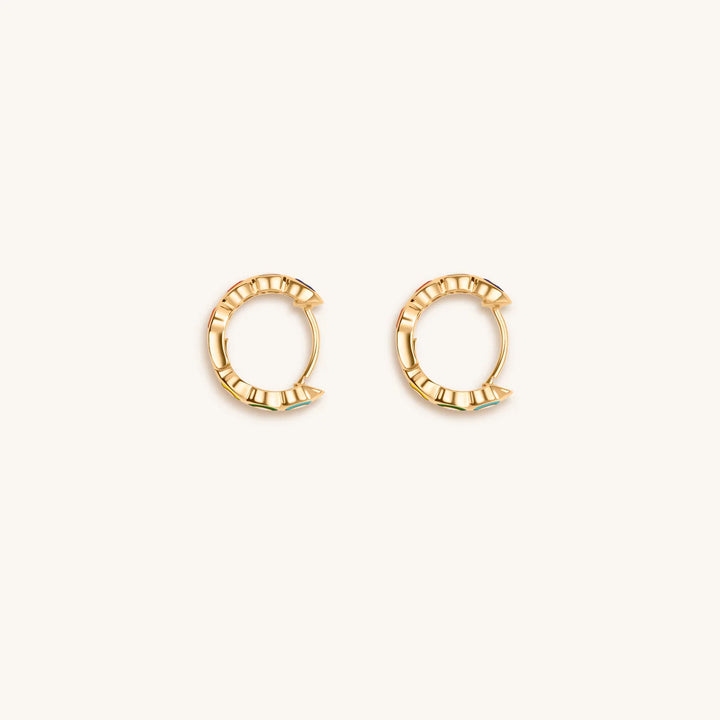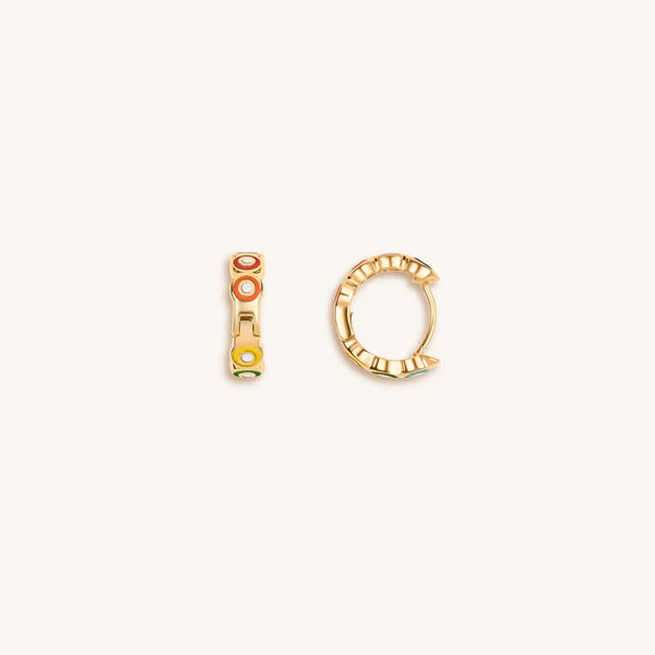 Awaken to the beauty of your highest self; now is the moment to embrace who you are. Our vivacious 'Aligned in Balance - Enamel Chakra Earrings' showcase the sole purpose of making your day with each glance at its lovely spectrum of colors. Each Evil Eye symbol represents one of the seven chakras through color. Your chakras will work as one beam of vivid power with the help of these colorful hoops.