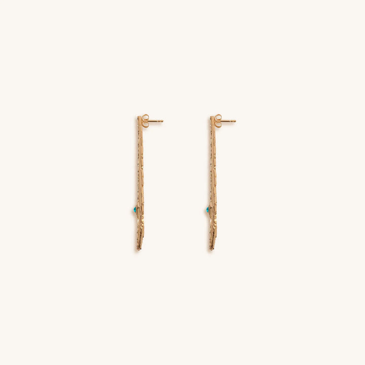 Feather Charm: protection, divine energy, spiritual connection, good luck 18K Gold Plated Brass Earrings Size: 2.5'. Culture: handmade in Bali, Indonesia.