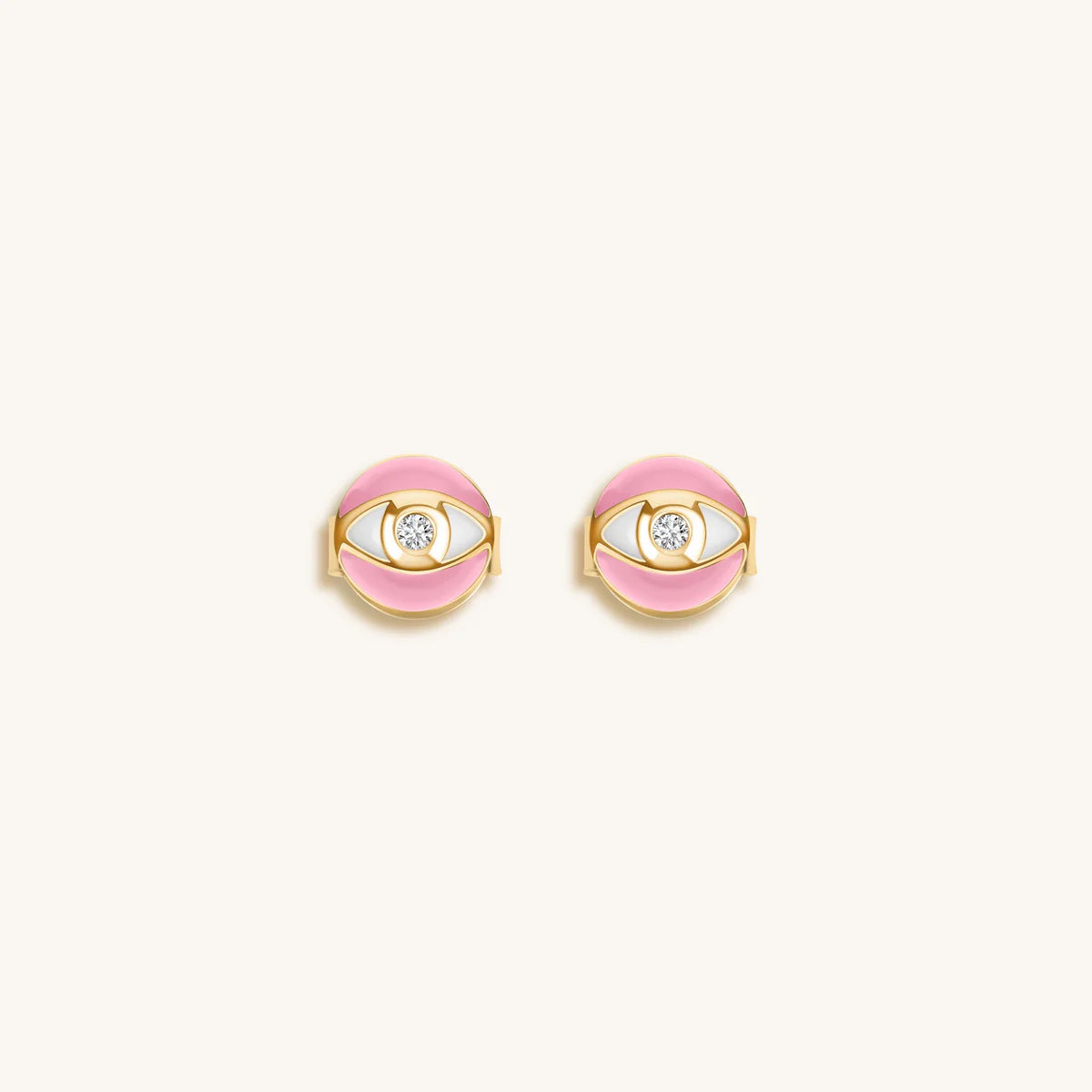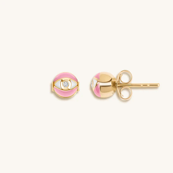 Evil Eye: Deflect Negativity1.2 mm Embedded Diamond ChipSize: 6 mmPink Enamel Stud Earrings925 Sterling Silver - 18K Gold PlatedHandmade in Bangkok, Thailand