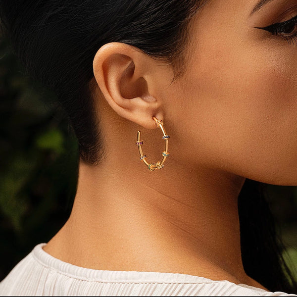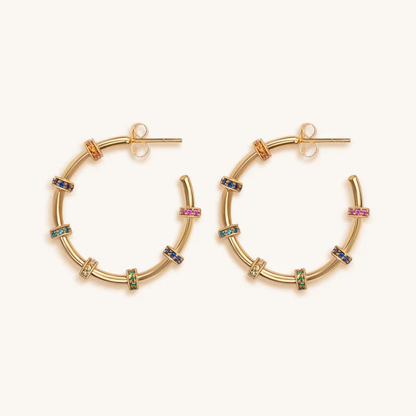 Chakra Symbolism: creativity, wisdom, strength1 mm Multicolor CZ Crystals18K Gold Plated BrassHoop EarringsSize: 1' DiameterCulture: handmade in Jaipur, India