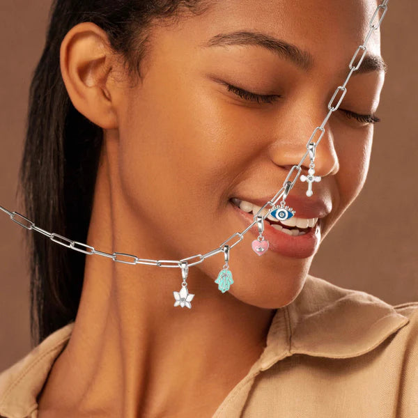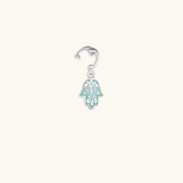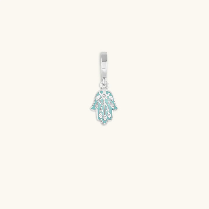 Pendant size including Bale 11 x 20 mm: Hamsa Charm 11 x 12 mm:Protection, Luck, Positive VibesTurquoise Enamel1.25 mm CZ CrystalSilver Rhodium Plated BrassHinge ClaspHandmade in Bangkok, Thailand