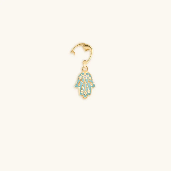 Pendant Size including Bale 10 x 20 mm : Hamsa Charm 10 x 12 mm Protection, Luck, Positive VibesTurquoise Enamel18K Gold Plated BrassHinge Clasp1.25 mm CZ CrystalHandmade in Bangkok, Thailand