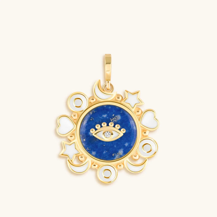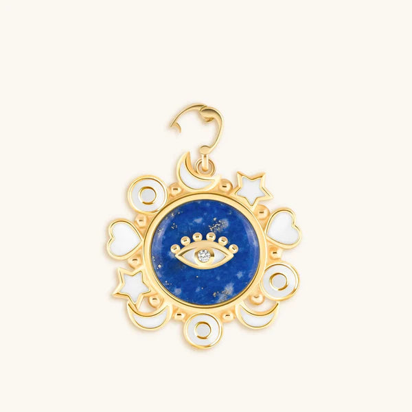 Empowered with the properties of multiple symbols, this 18K gold-plated charm is inlaid with Lapis Lazuli. While the sacred symbols serve as divine protection, the rich blue stone encourages wisdom and truth. Secured with the hinge clasp, add it to a bracelet or necklace for guidance on your journey.