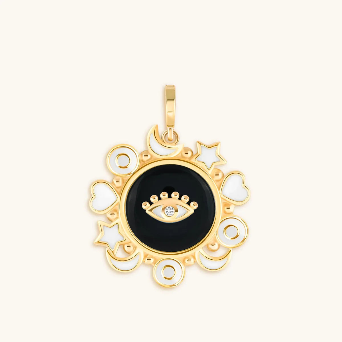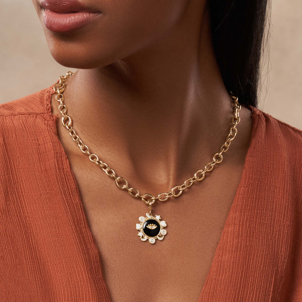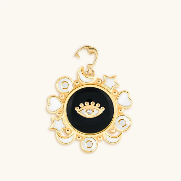 Designed in 18K Gold, this multi-symbol charm is radiant with energetic potential. While the sacred symbols wrap you in protection, the Black Onyx stone absorbs negative energy and keeps you grounded. Using the hinge clasp, easily add it to a bracelet or necklace to encourage a life of purpose.
