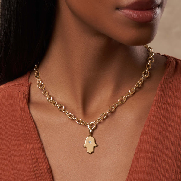 Handcrafted in 18K Gold plated Brass, this Hamsa Hand charm radiates with protective energy. Embellished with a luminous CZ Crystal, it surrounds you in loving light and ensures your path is free of obstacles. The hinge clasp makes it easy to secure the charm to a bracelet or necklace, acting as a trustworthy guardian.