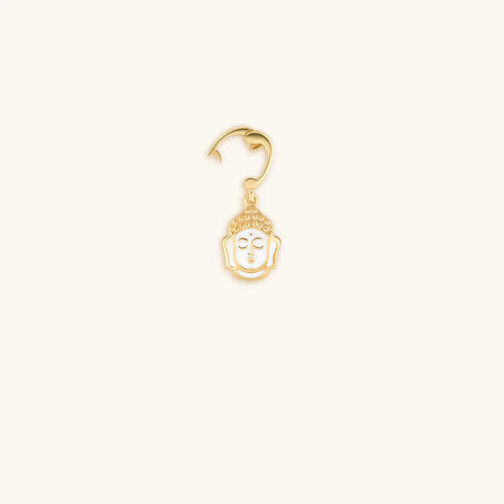 Pendant Size Including Bale 8 x 18 mm: Buddha Charm 8 x 10 mmSpiritual Awakening, Compassion, LoveWhite Enamel1.25 mm CZ Crystal18K Gold Plated BrassHinge ClaspHandmade in Bangkok, Thailand