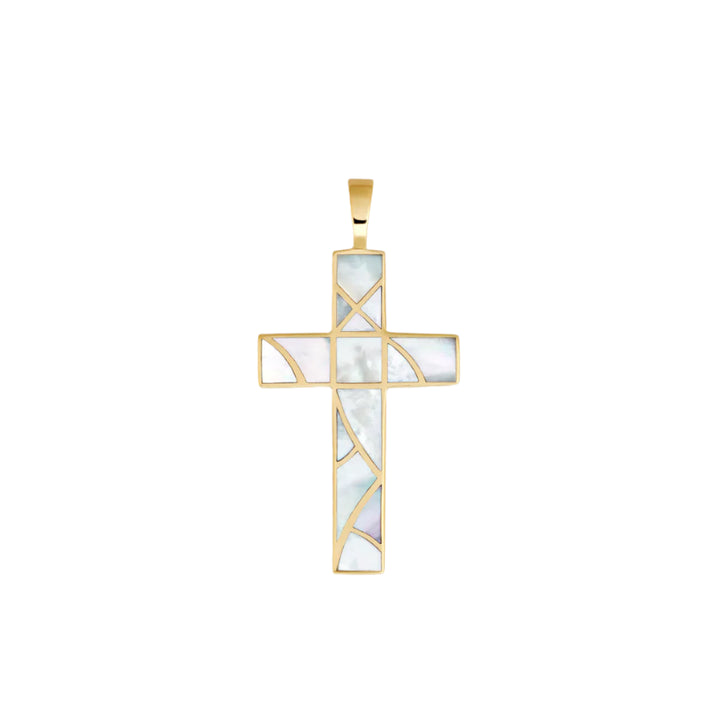 Size: 22 x 35 mm18K Gold-Plated BrassMother of PearlHinge ClaspMother of Pearl: Intuition, Imagination, ProtectionCross: Faith, Love, ProtectionHandmade in: Thailand
