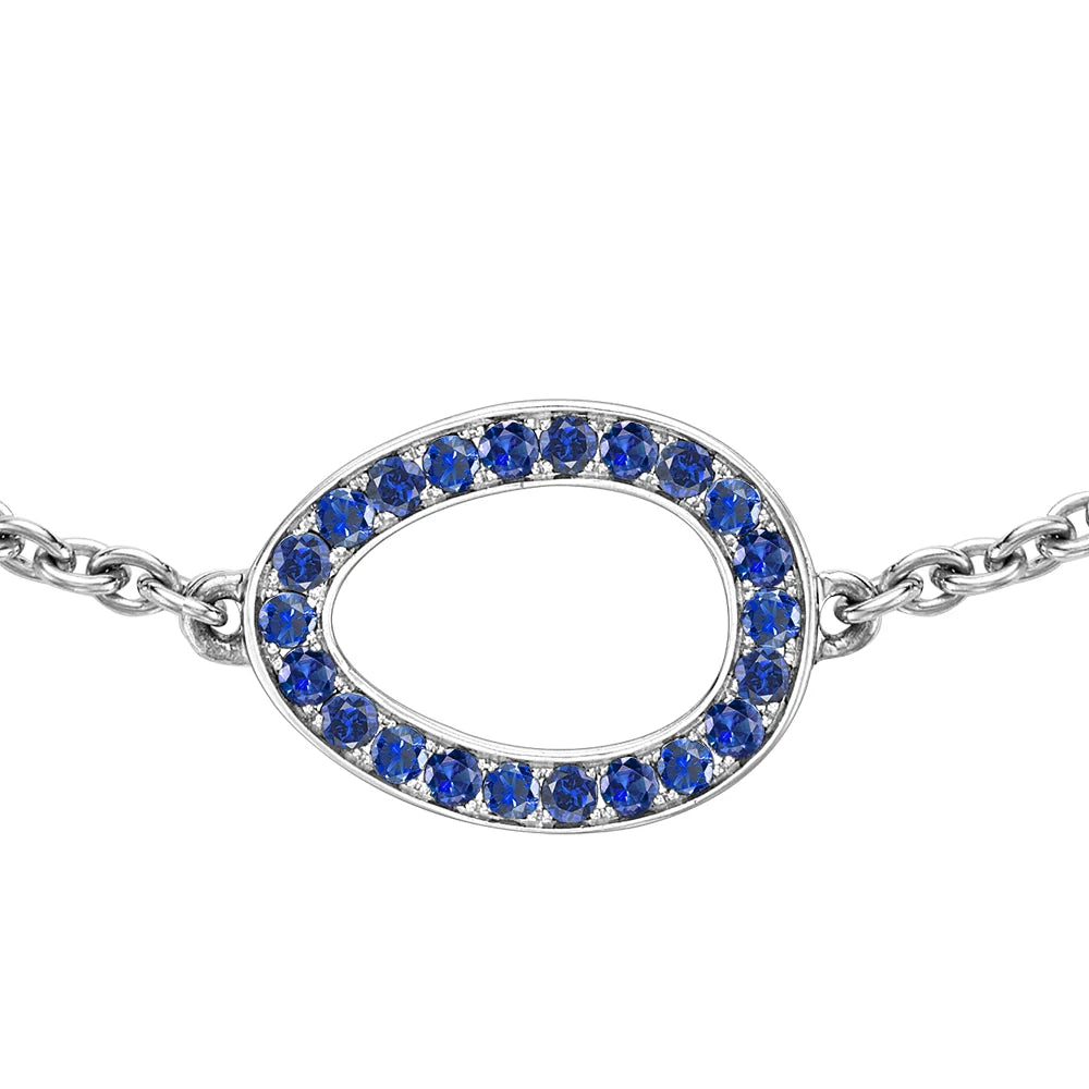 Handcrafted in 18-karat white gold with 22 pavé-set round blue sapphires (12x9mm sapphire egg) and a hidden Mozambican ruby. Trace chain measures 1.5mm wide and 17.5cm long, with an adjustable length.