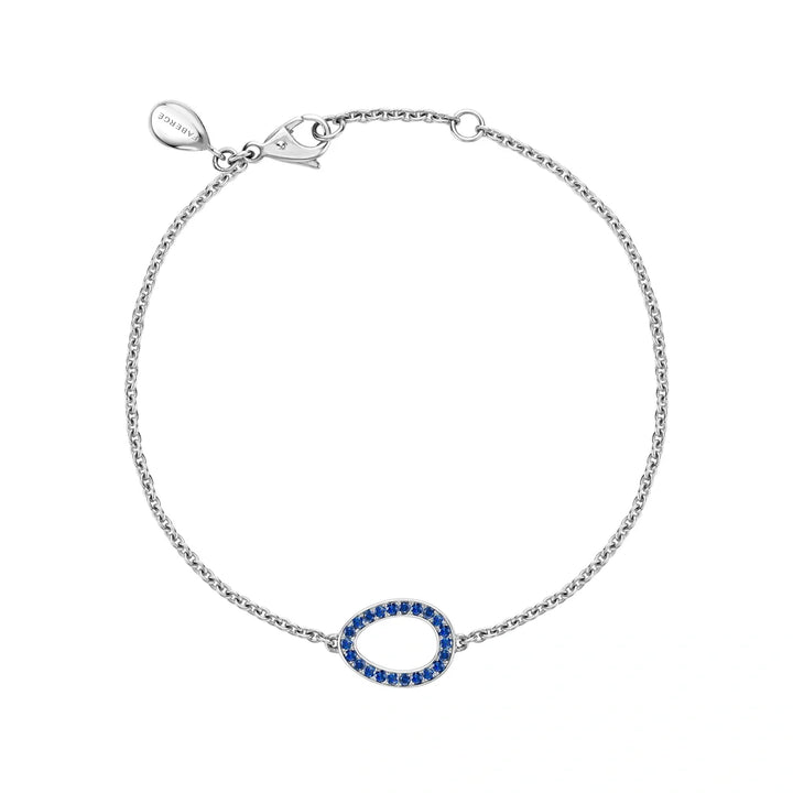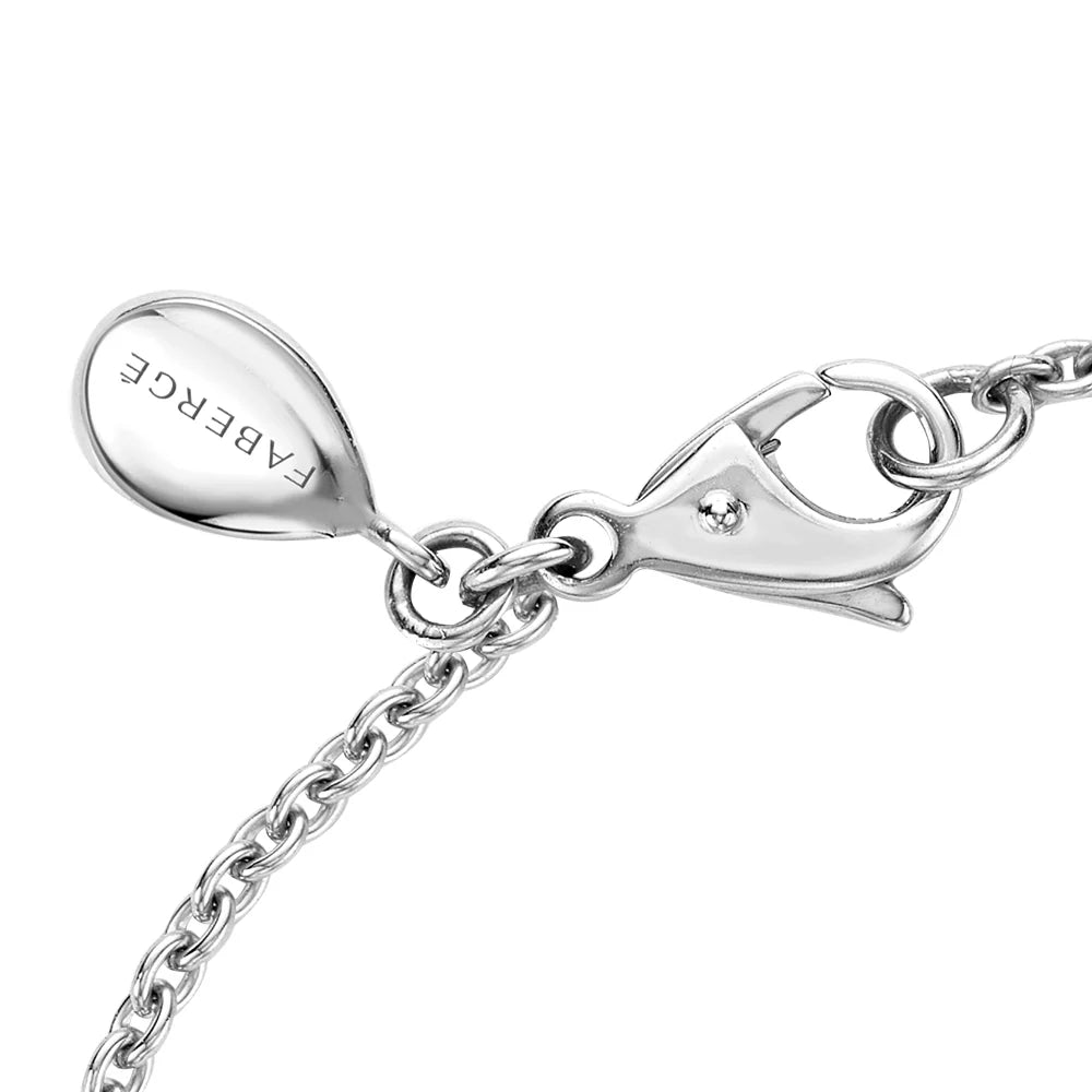 This Colours of Love Sasha White Gold Blue Sapphire Egg Chain Bracelet by Fabergé offers an elegant and modern take on the iconic egg silhouette. Featuring 22 pavé-set round blue sapphires, the 12x9mm sapphire egg sits gracefully on an 18-karat white gold trace chain. The chain is 1.5mm wide and 17.5cm long, with an adjustable length option for a perfect fit. True to Fabergé’s commitment to surprise and delight, a hidden Mozambican ruby is nestled at the back of the egg. This piece embodies the beauty of the Colours of Love collection, merging exceptional gemstones, artful design, and masterful craftsmanship, all while celebrating a life in color.