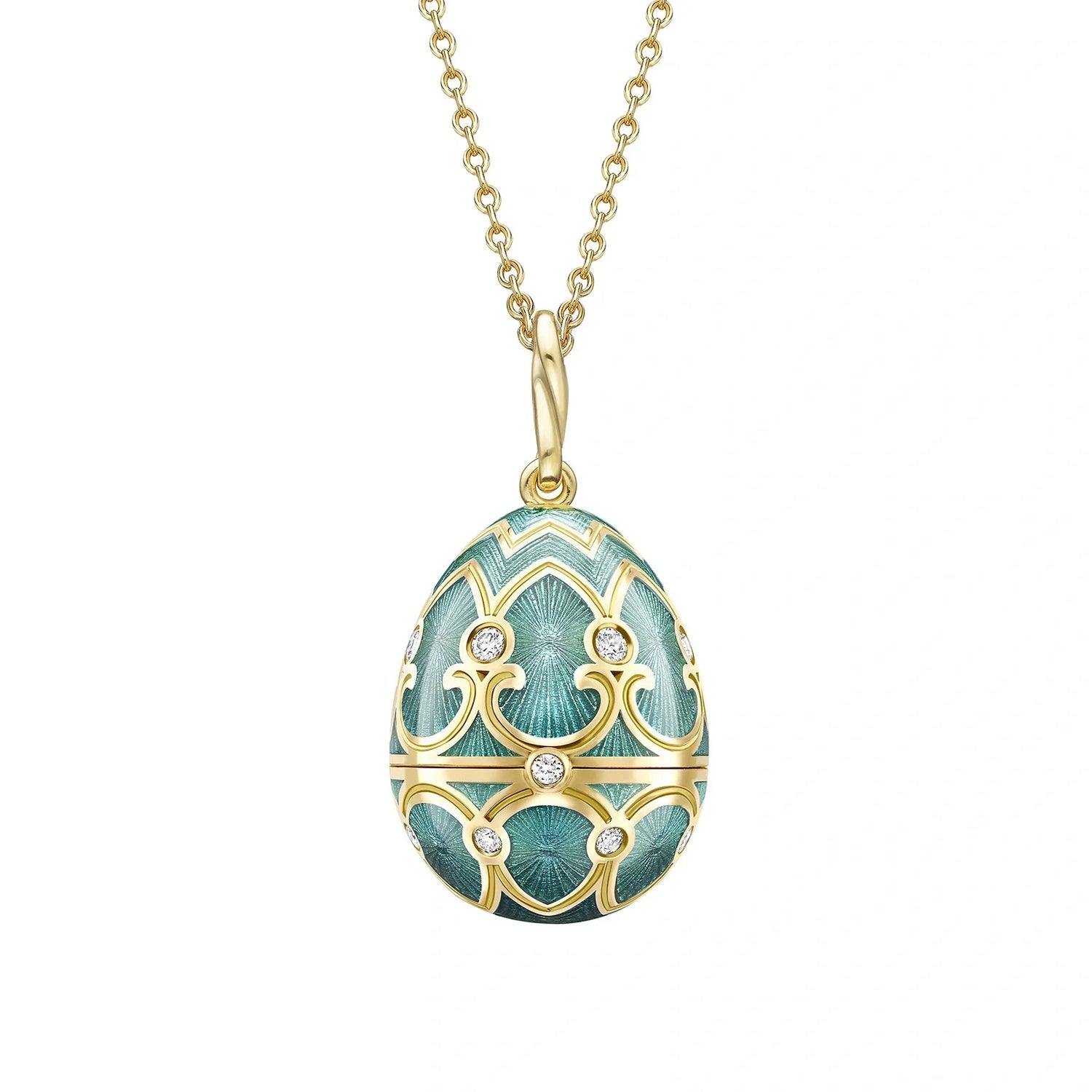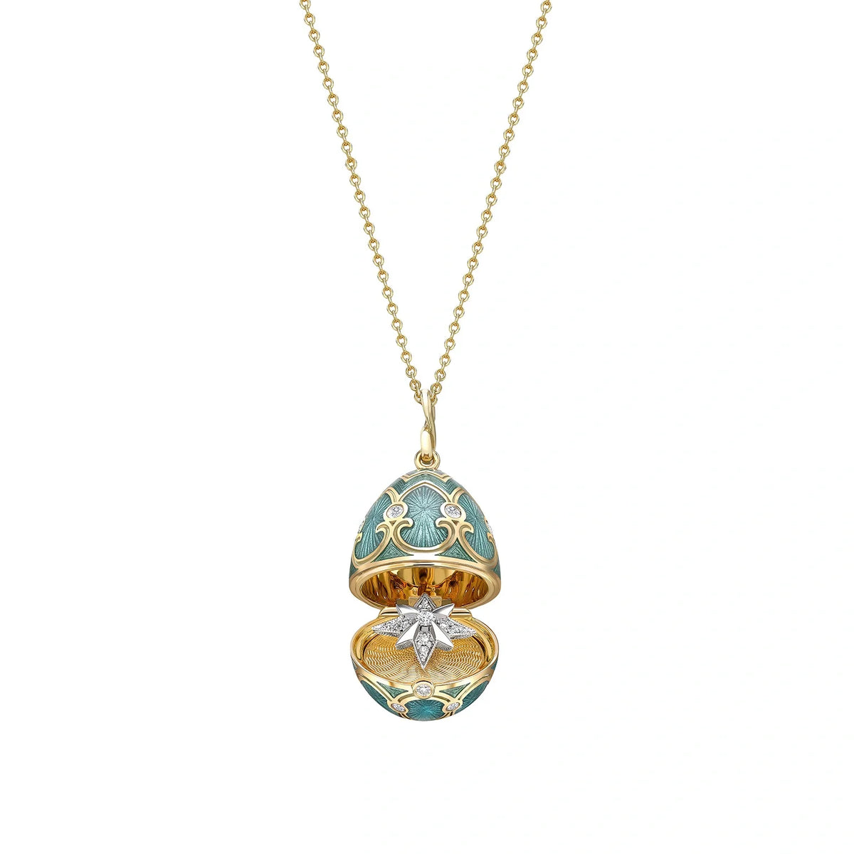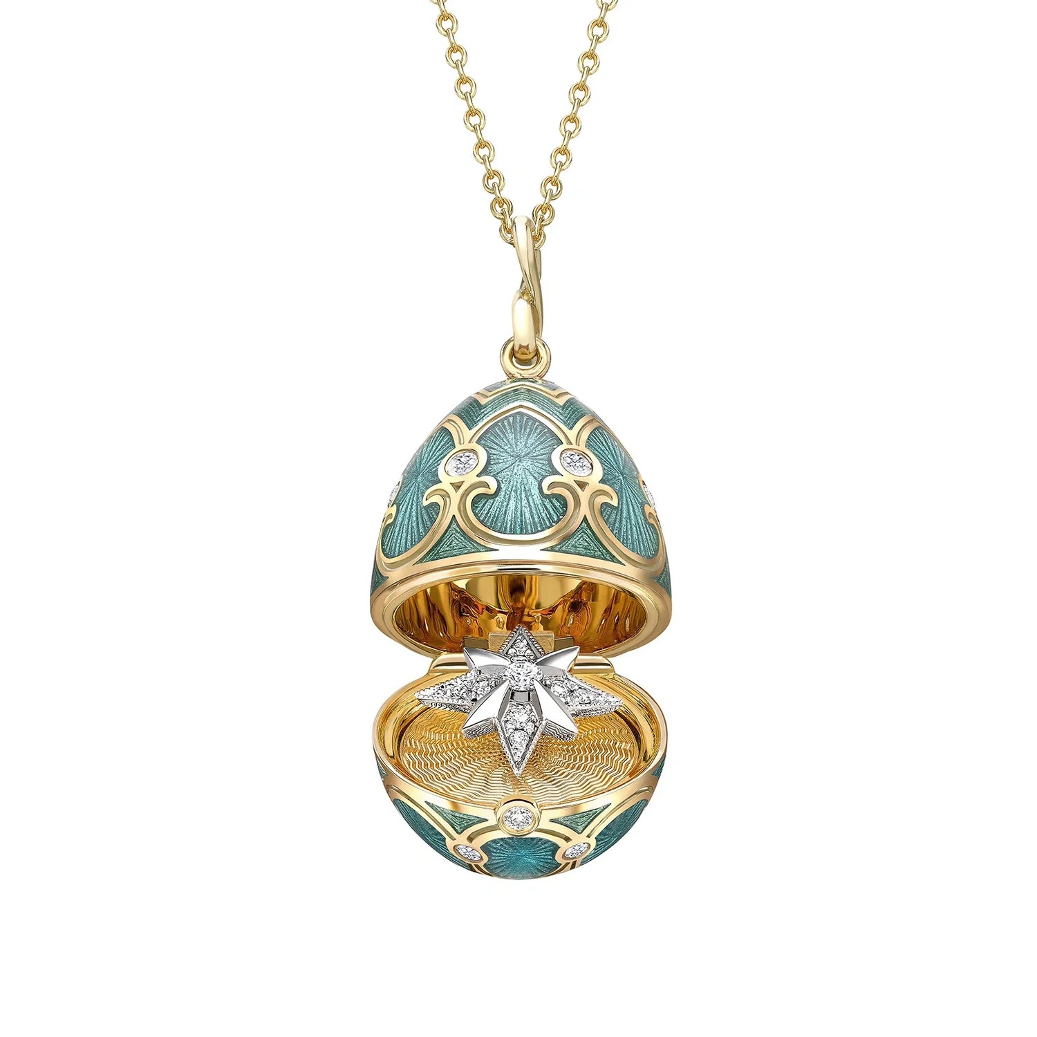 Handcrafted in 18-karat yellow gold with 23 round white diamonds and teal guilloché enamel. Star-shaped surprise inside with brilliant-cut white diamonds. Locket measures 22mm and comes with a yellow gold chain. Guilloché enamelling and hand-engraving techniques.