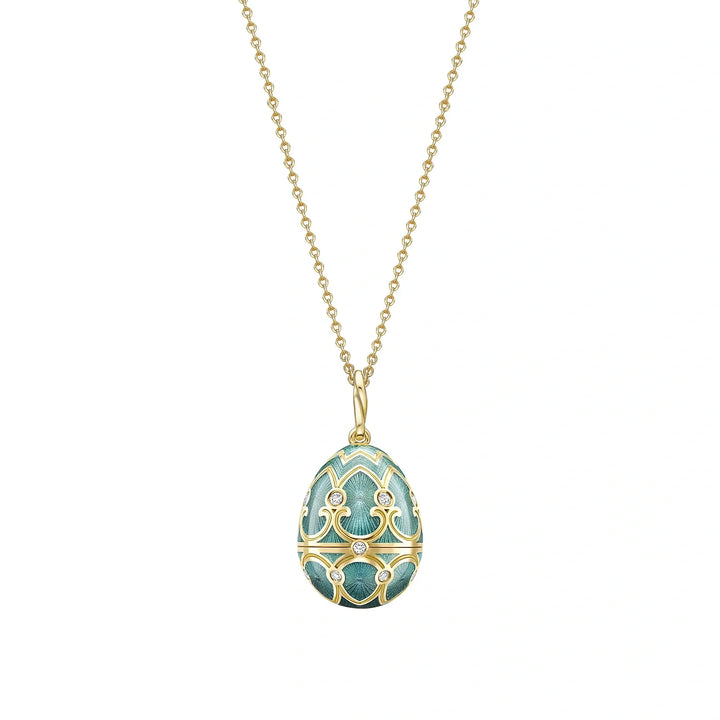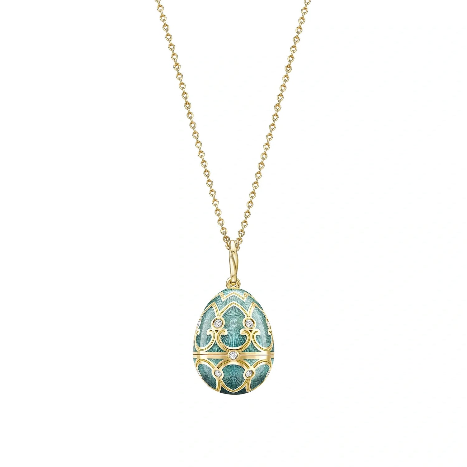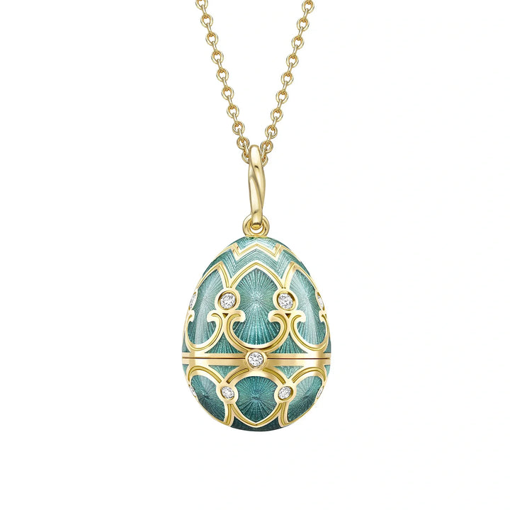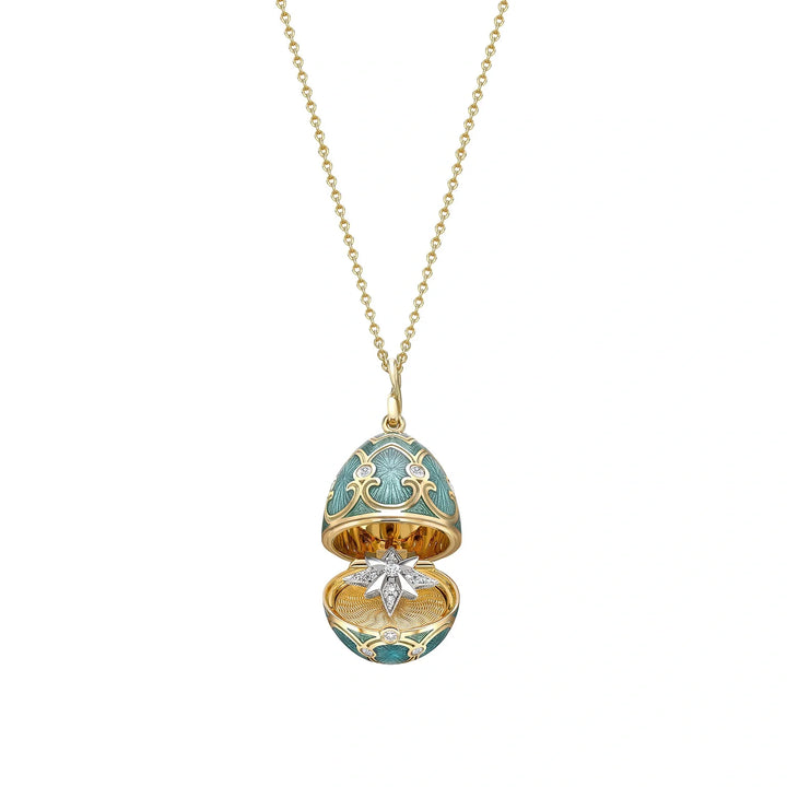 The Heritage Yellow Gold Diamond & Teal Guilloché Enamel Trembling Star Surprise Locket by Fabergé is a stunning piece of artistry and innovation. Set in 18-karat yellow gold and decorated with 23 round white diamonds and teal enamel, the locket opens to reveal a dazzling star-shaped surprise composed of brilliant-cut white diamonds. The star is designed to tremble and sparkle when touched, adding an interactive element to the design. The locket measures 22mm and is paired with a yellow gold chain.
