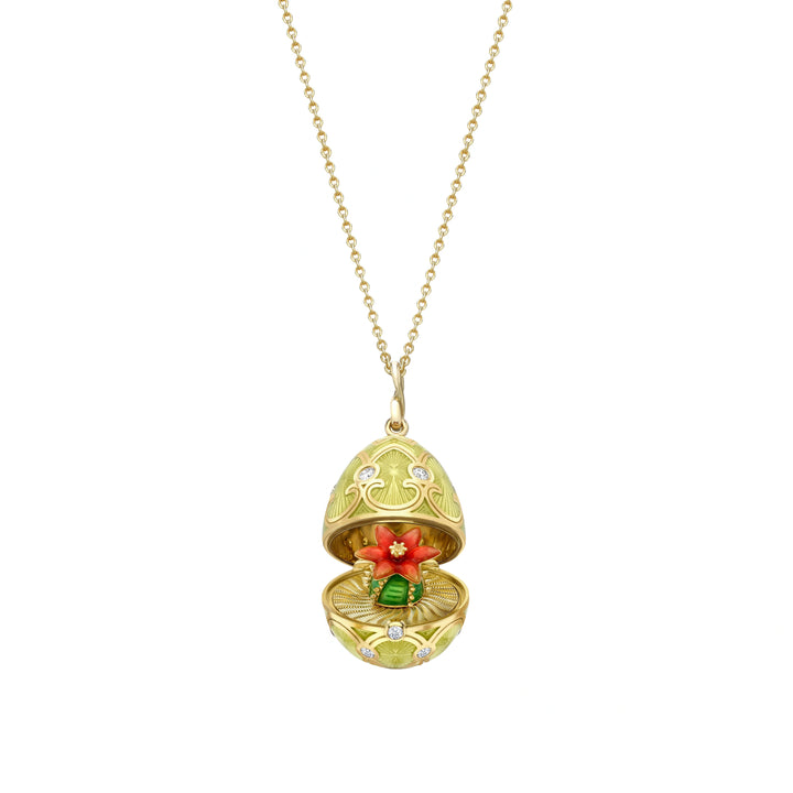 Materials: Handcrafted in 18-karat yellow gold. Features a heart-shaped ruby from Gemfields' Mozambican mines. The bail is inspired by the 'G' shape from the Goldfinger movie, with the same font as the character’s signet ring. Egg-shaped locket opens to reveal the ruby.
