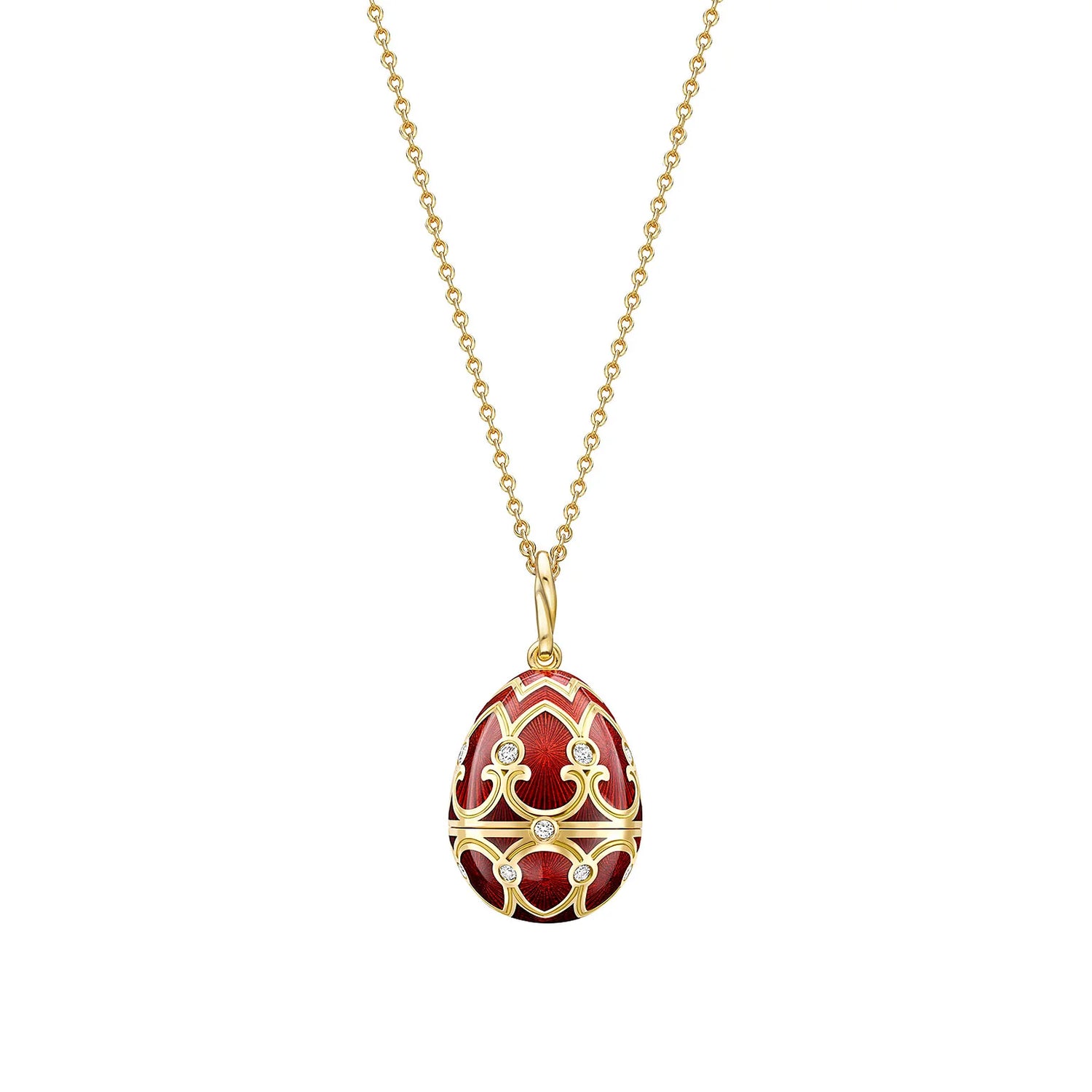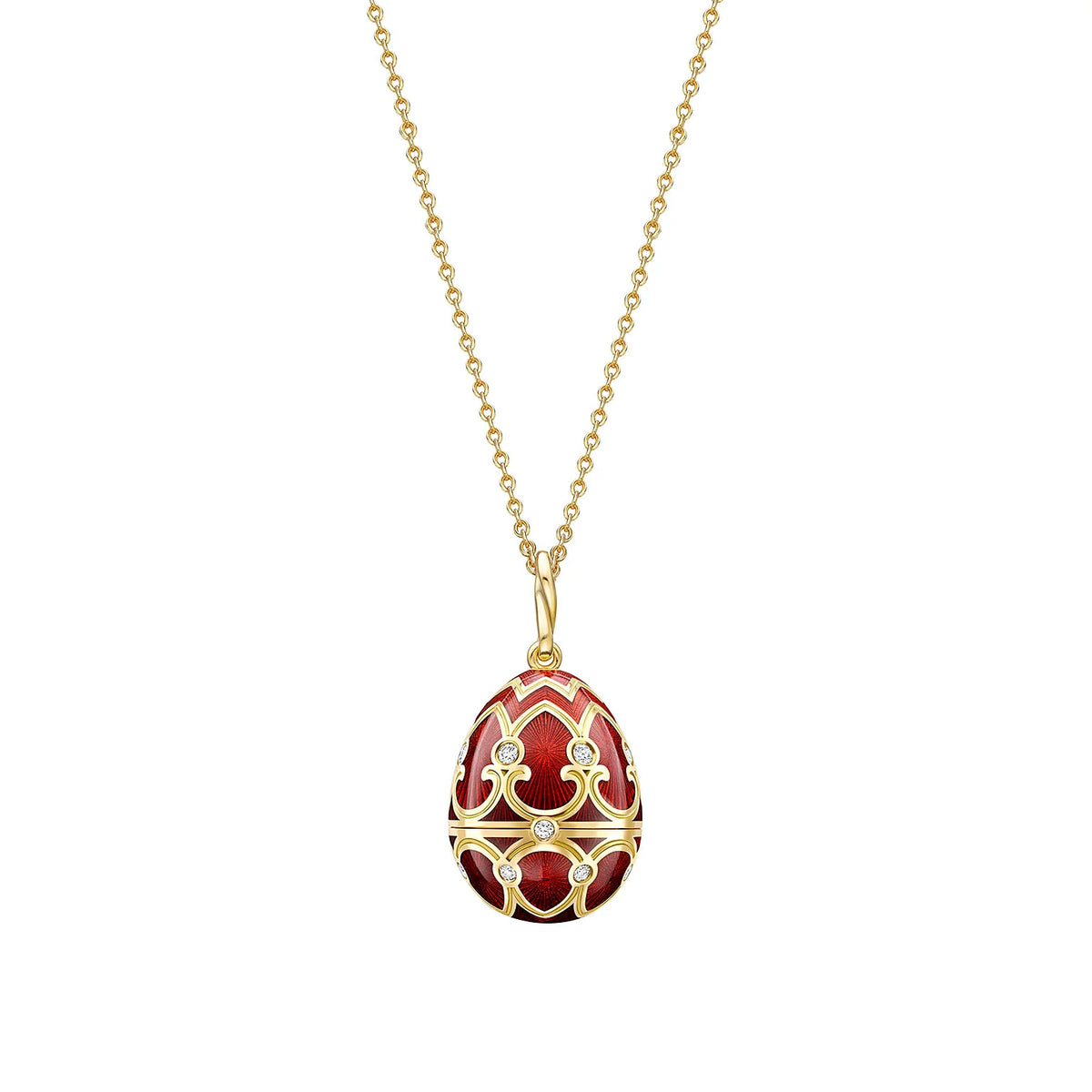 Crafted in 18k yellow gold with red guilloché enamel and round white diamonds. Interior features a pink guilloché enamel wild rose, set with a white round diamond. Locket measures 22mm and comes with a 50cm long chain in 18k yellow gold. Guilloché enamelling and hand-engraving techniques.