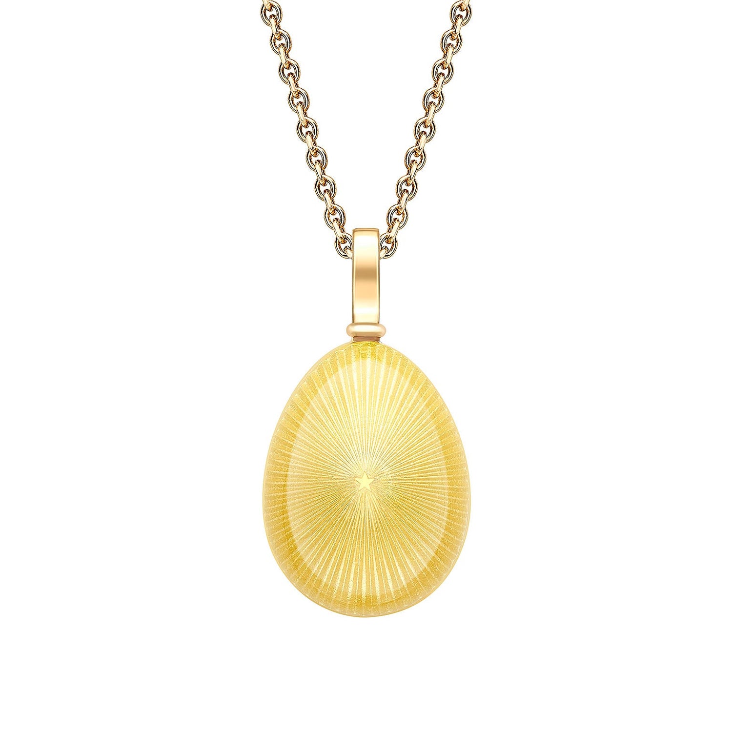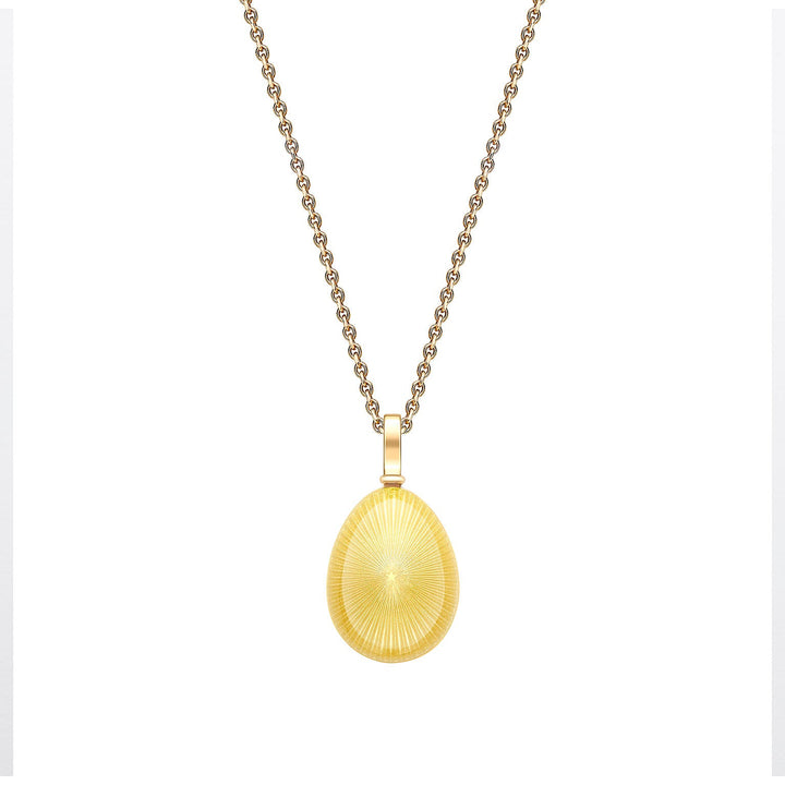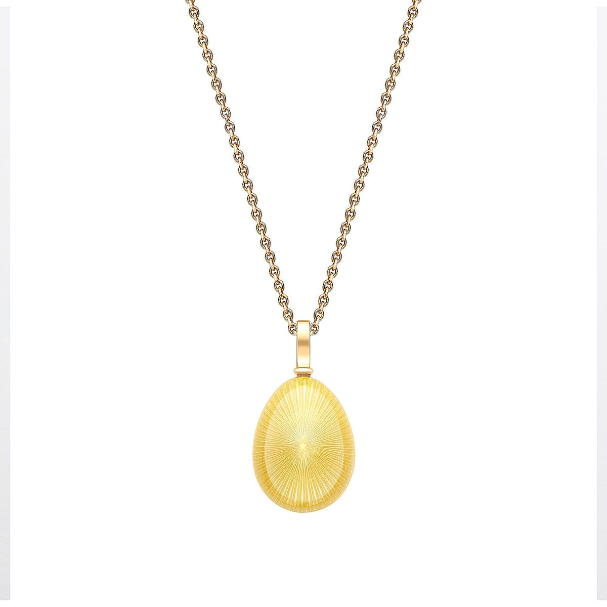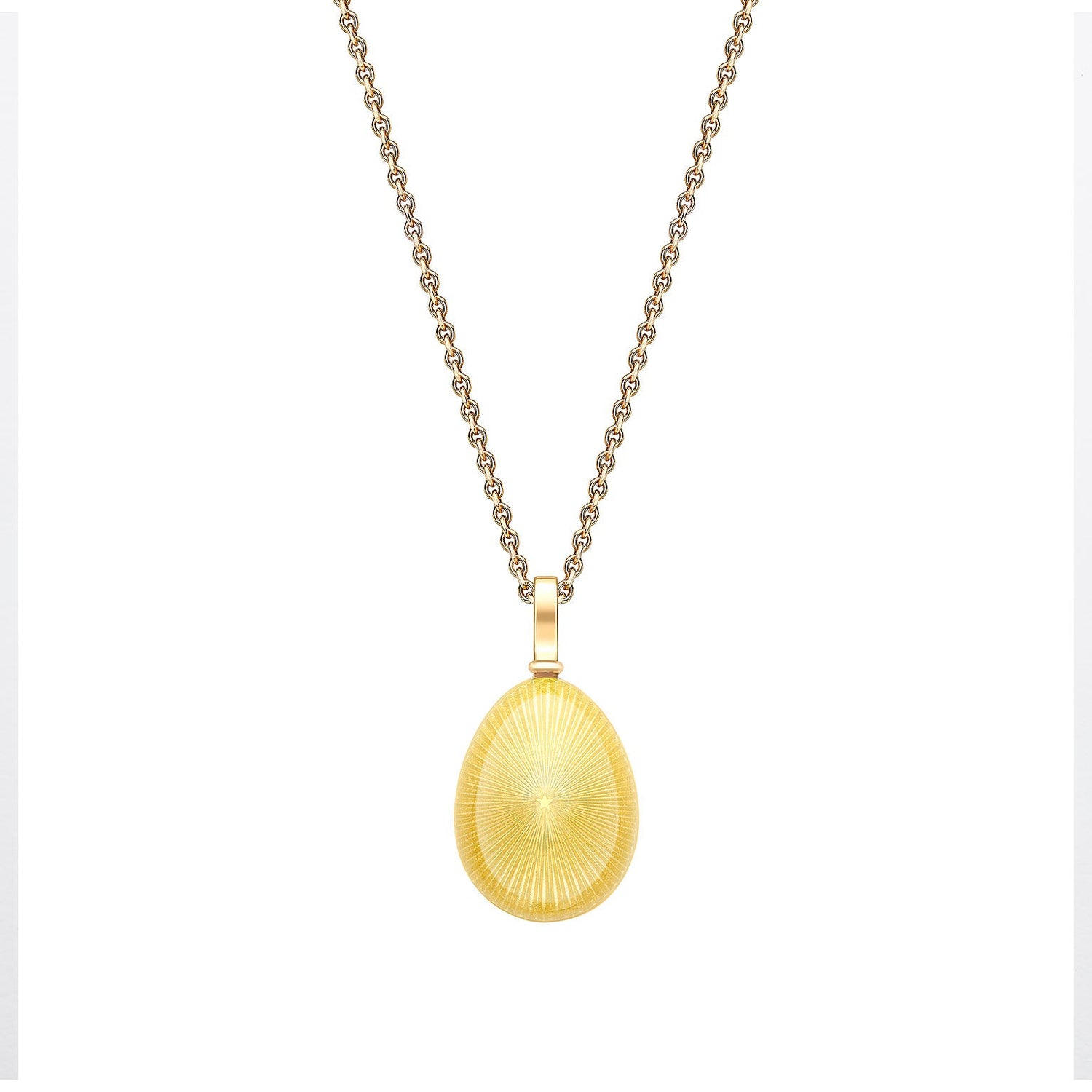 The Heritage Yellow Gold & Gold Enamel Egg Pendant is a refined and elegant piece that combines gold enamel with a starburst guilloché pattern, set in 18 karat yellow gold. This pendant evokes the intricate designs of Fabergé’s historical pieces, highlighting the beauty of traditional guilloché enamelling and hand-engraving techniques. It measures 16mm and is suspended from an 18 karat yellow gold chain. The piece embodies Fabergé's iconic craftsmanship and attention to detail.