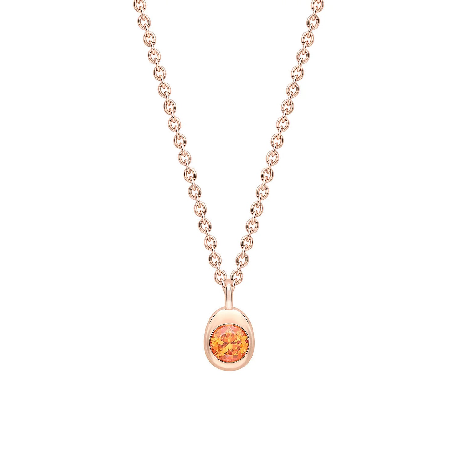 The Colours of Love Cosmic Curve Rose Gold & Orange Spessartite Pendant features a round orange spessartite, set in 18 karat rose gold. Spessartite is known for its vibrant orange hue and symbolizes vitality and energy. The pendant is part of the Cosmic Curve collection, which represents eternal connections. A hidden Gemfields Mozambican ruby on the back adds an extra layer of surprise.