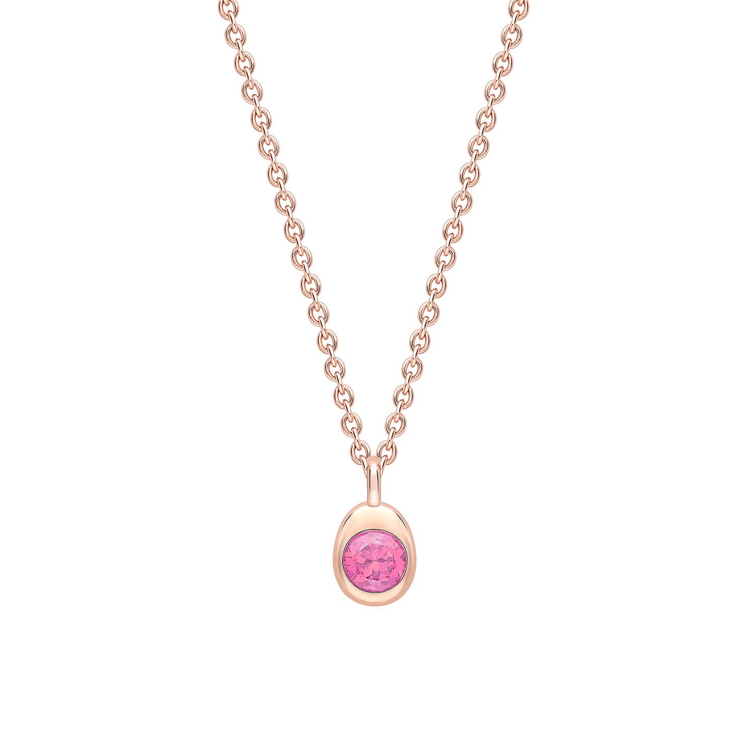 Crafted from 18k rose gold with a round pink sapphire. The pendant contains a hidden Mozambican ruby on the back. The piece represents eternal bonds, symbolized by the pink sapphire’s associations with love and healing.