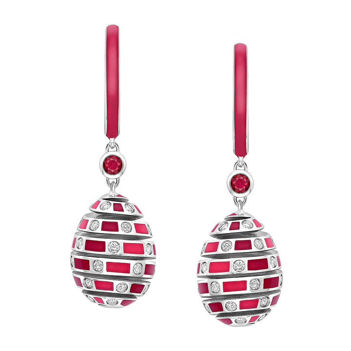 Fabergé x Beetlejuice Beetlejuice White Gold, Ruby and Red Enamel Spiral Earrings showcase responsibly mined round Gemfields Mozambican rubies, set in 18k white gold and decorated with complementing red UV enamel and round brilliant-cut white diamonds. These earrings echo the iconic stripes of Beetlejuice’s suit, the Sandworms, and the floors of the afterlife in the film, creating a dynamic and bold design that is as playful as it is elegant. The earrings blend Fabergé’s iconic egg shape with references to Tim Burton’s fantastical world.