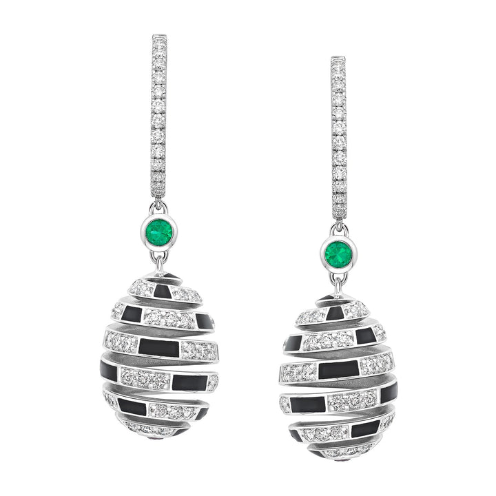 These Fabergé x Beetlejuice Beetlejuice White Gold Emerald and Black Enamel Spiral Earrings by Fabergé capture the essence of Tim Burton’s darkly whimsical world. Each earring features a responsibly sourced round Gemfields Zambian emerald, set in 18k white gold and surrounded by brilliant white diamonds. The black UV enamel adds depth and drama, while the striped monochrome design alludes to Betelgeuse's iconic suit, sandworms, and the afterlife’s eerie corridors. These earrings are an exquisite balance of elegance, storytelling, and luxury.