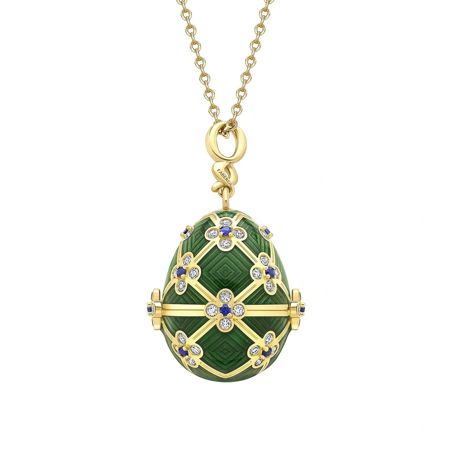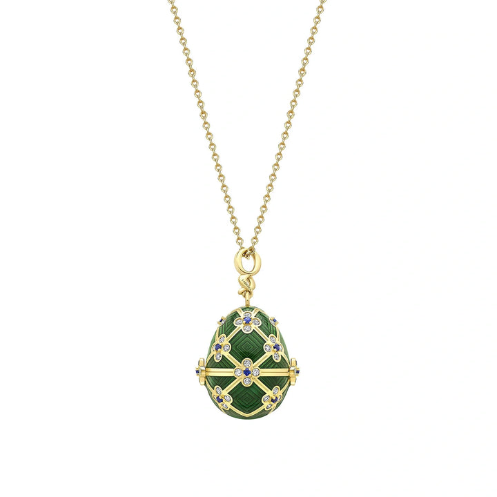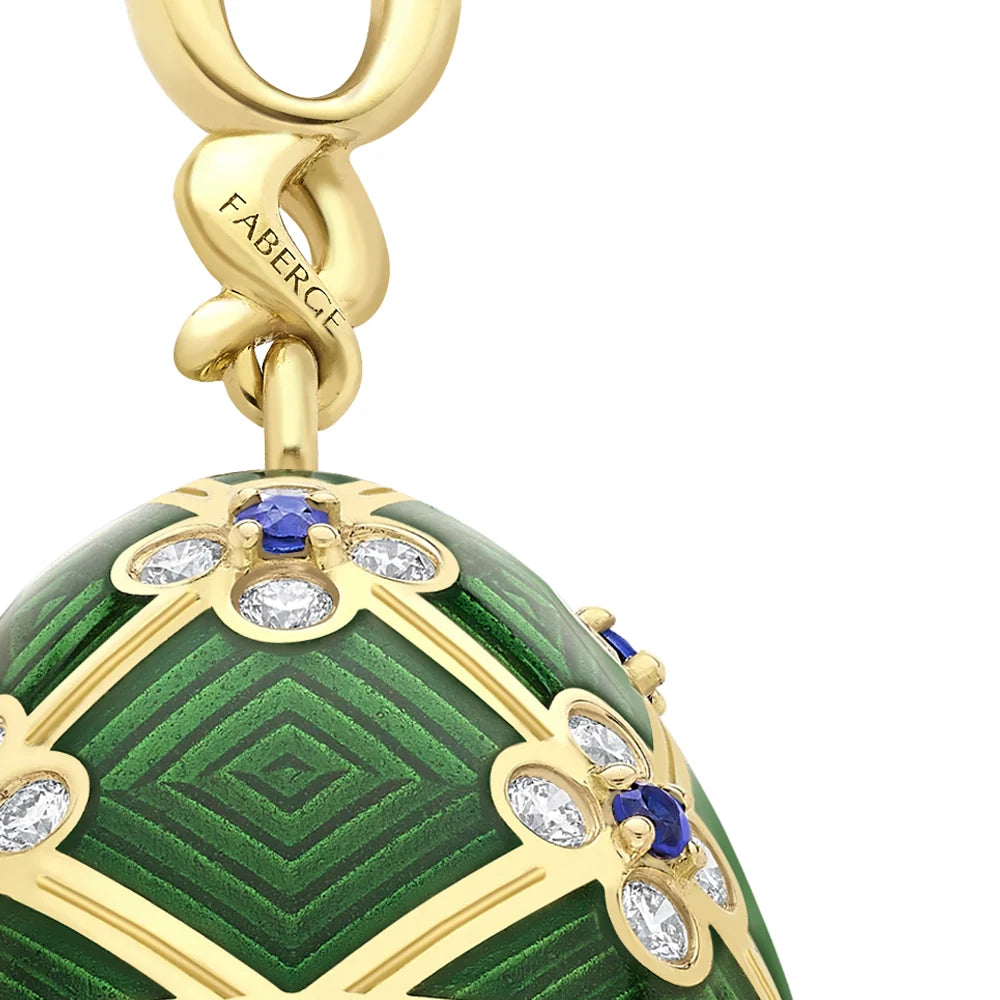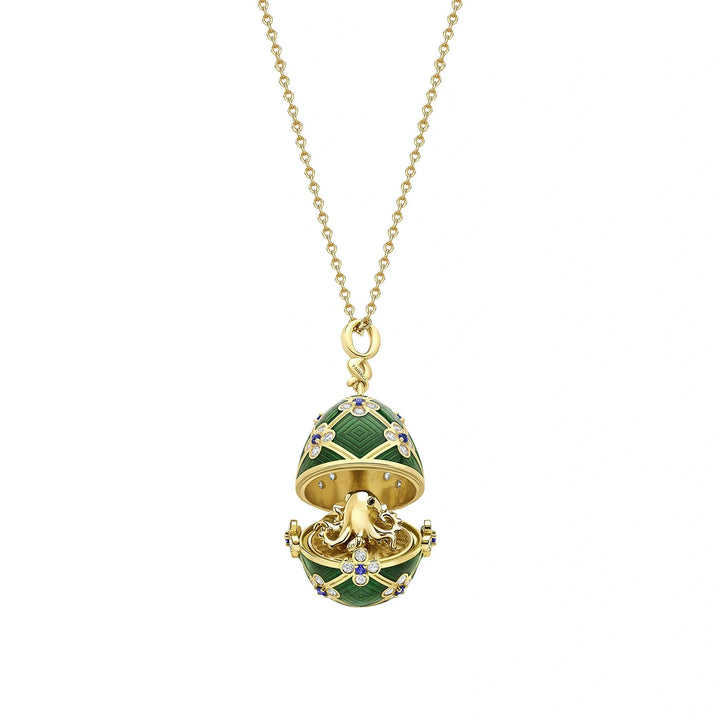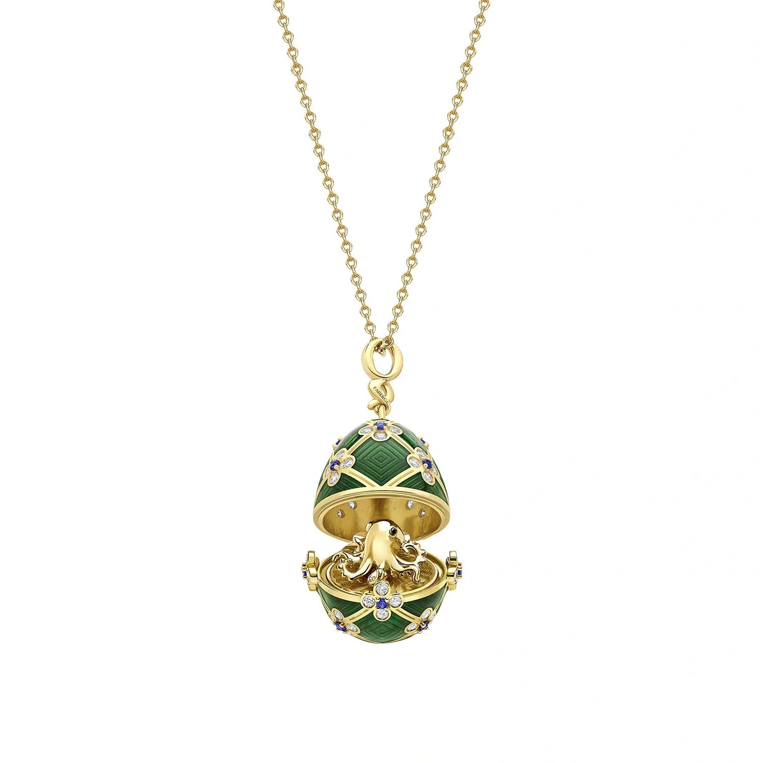 This Fabergé x 007 Special Edition Octopussy Egg Surprise Locket is a masterpiece of design and storytelling. Crafted from 18k yellow gold, the egg is adorned with green guilloché enamel, 60 white diamonds, and 15 blue sapphires. Inspired by the Fabergé egg featured in the film Octopussy, its intricate lattice framework and floral-like embellishments are paired with a miniature surprise: an 18k gold octopus with black diamond eyes hidden inside.