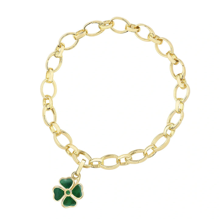 This Heritage Yellow Gold Green Guilloché Enamel Clover Charm by Fabergé brings luck and elegance together in one beautiful design. Crafted from 18k yellow gold, the charm features delicately applied green guilloché enamel that forms the clover leaves, offering a vibrant pop of colour and timeless appeal. The charm is a part of the Heritage collection, which draws inspiration from Fabergé’s historical masterpieces and utilizes intricate traditional techniques such as guilloché enamelling and hand-engraving. This piece is an ideal addition to a charm bracelet, symbolizing luck and prosperity with a modern yet timeless aesthetic. Pair with the Rose Gold Chain Charm Bracelet (sold separately) to complete the look.