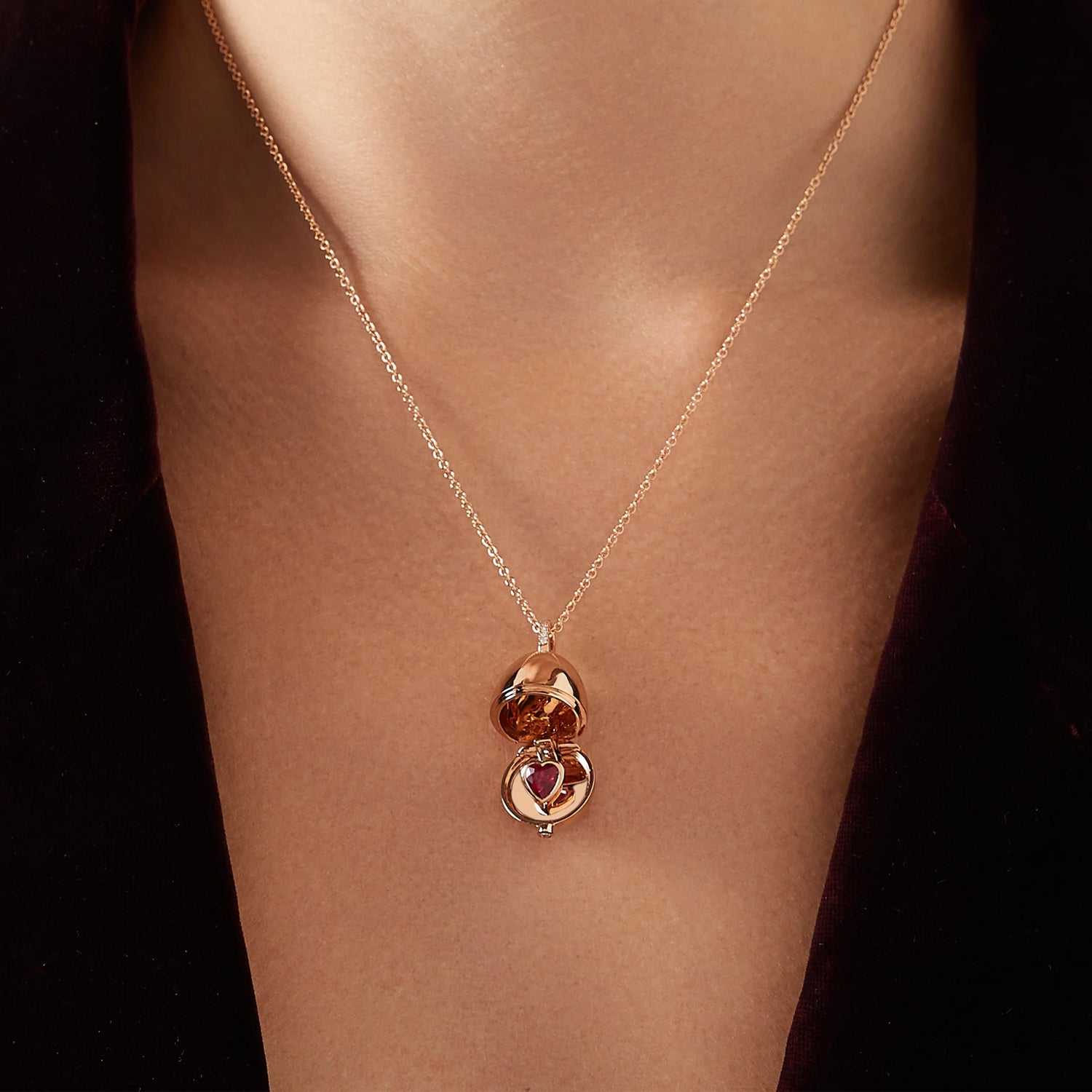 This Fabergé Essence Rose Gold Heated Ruby Heart Surprise Locket is a stunning piece that embodies both romance and surprise. Crafted from 18k rose gold, the locket opens to reveal a heart-shaped Mozambican ruby from Gemfields, adding an element of secret allure. The bale of the locket is adorned with 14 round brilliant-cut diamonds, enhancing its beauty and sparkle. Inspired by Fabergé’s iconic Imperial Eggs, this piece brings a modern interpretation of luxury, blending precious metals, diamonds, and coloured gemstones in perfect harmony. The heated ruby, known for its deep, captivating hue, symbolizes love and passion, making this locket an ideal piece for someone who treasures beauty with hidden meanings.