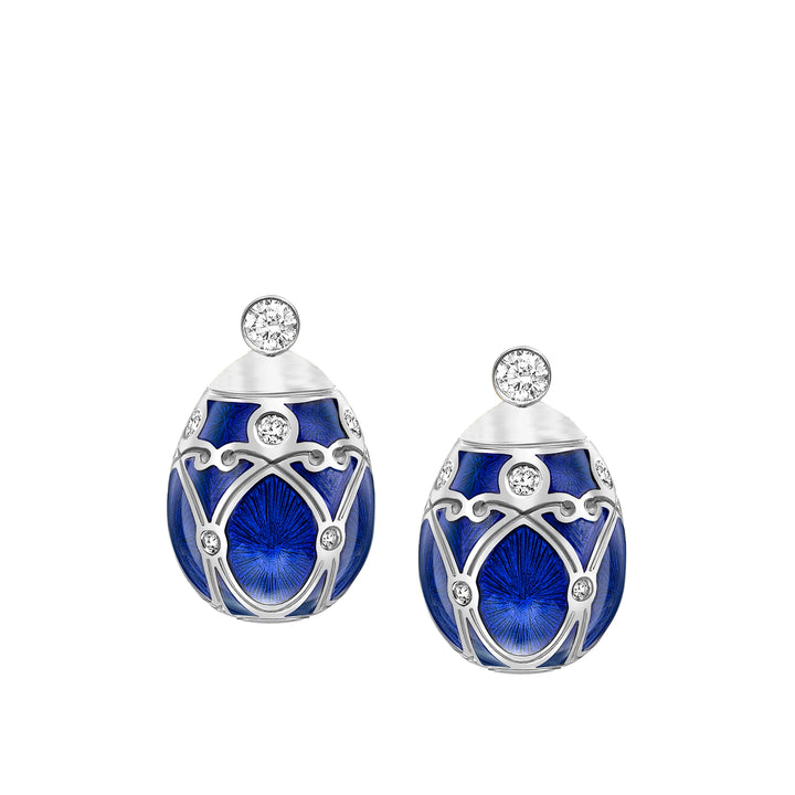 These Heritage White Gold Diamond and Blue Guilloché Enamel Stud Earrings by Fabergé are a refined and timeless expression of elegance. The earrings are crafted from 18k white gold and decorated with a rich blue guilloché enamel, a technique that adds depth and texture to the design. Each egg-shaped stud is adorned with round white diamonds, adding a touch of sparkle to the vibrant blue hue. Measuring 14mm, these earrings are the perfect balance of heritage and modern luxury. They embody Fabergé’s commitment to quality, intricate craftsmanship, and the art of surprise.