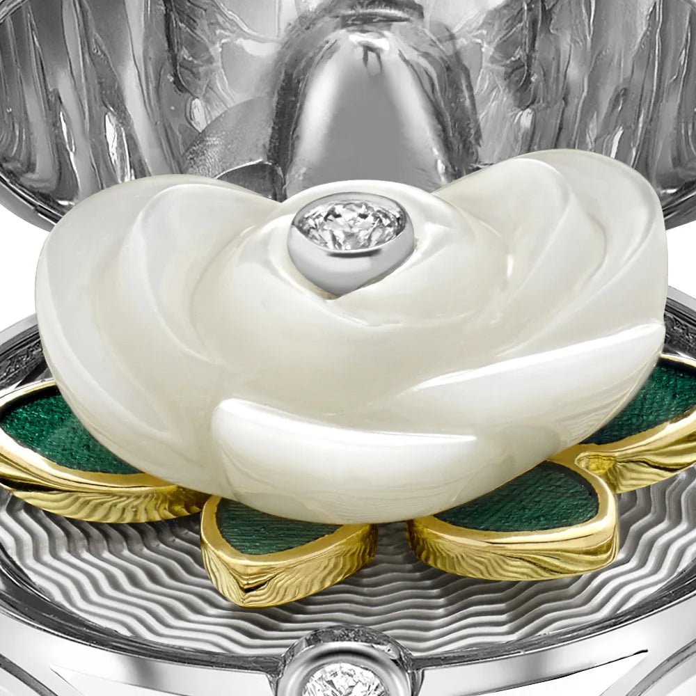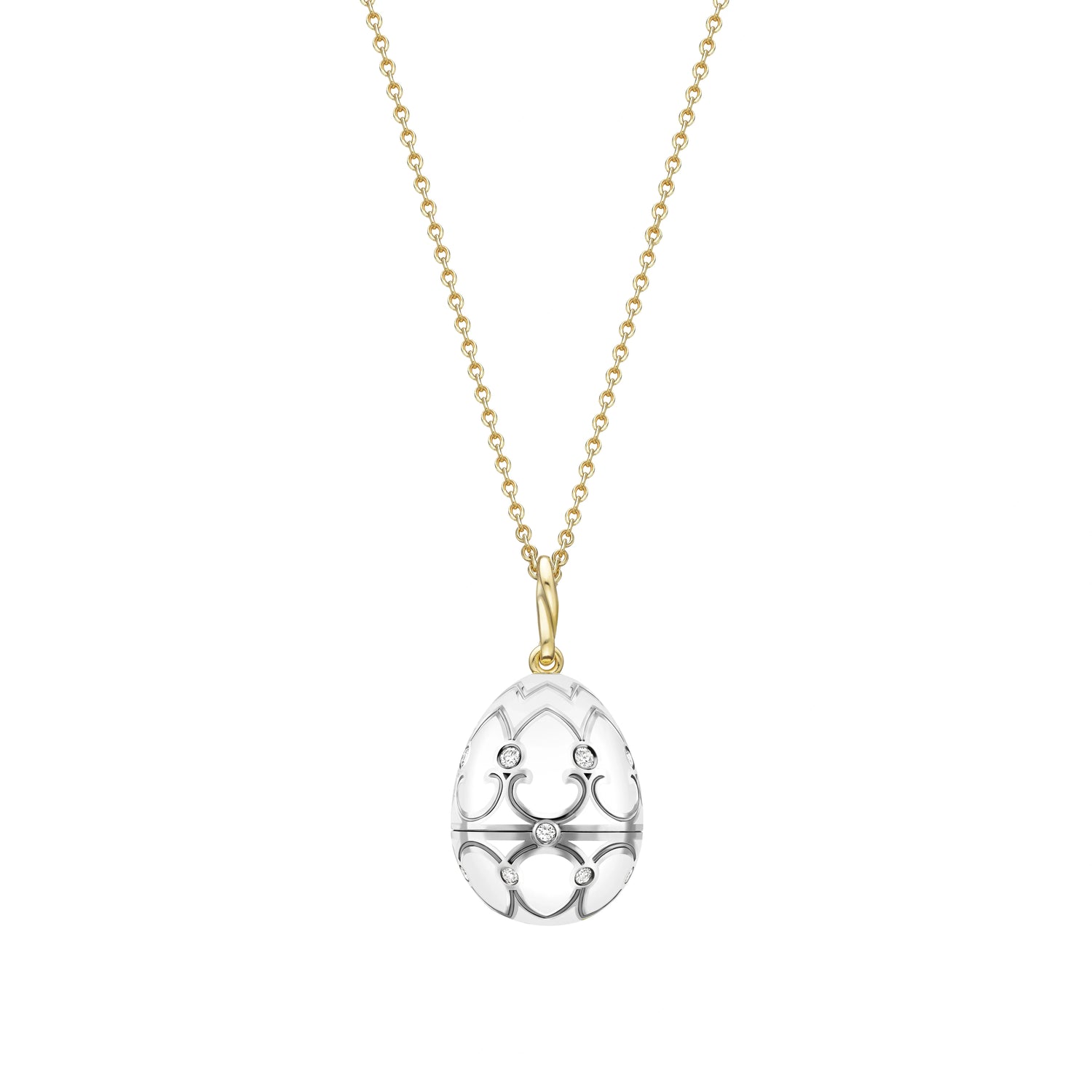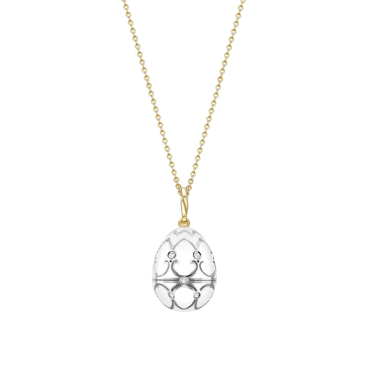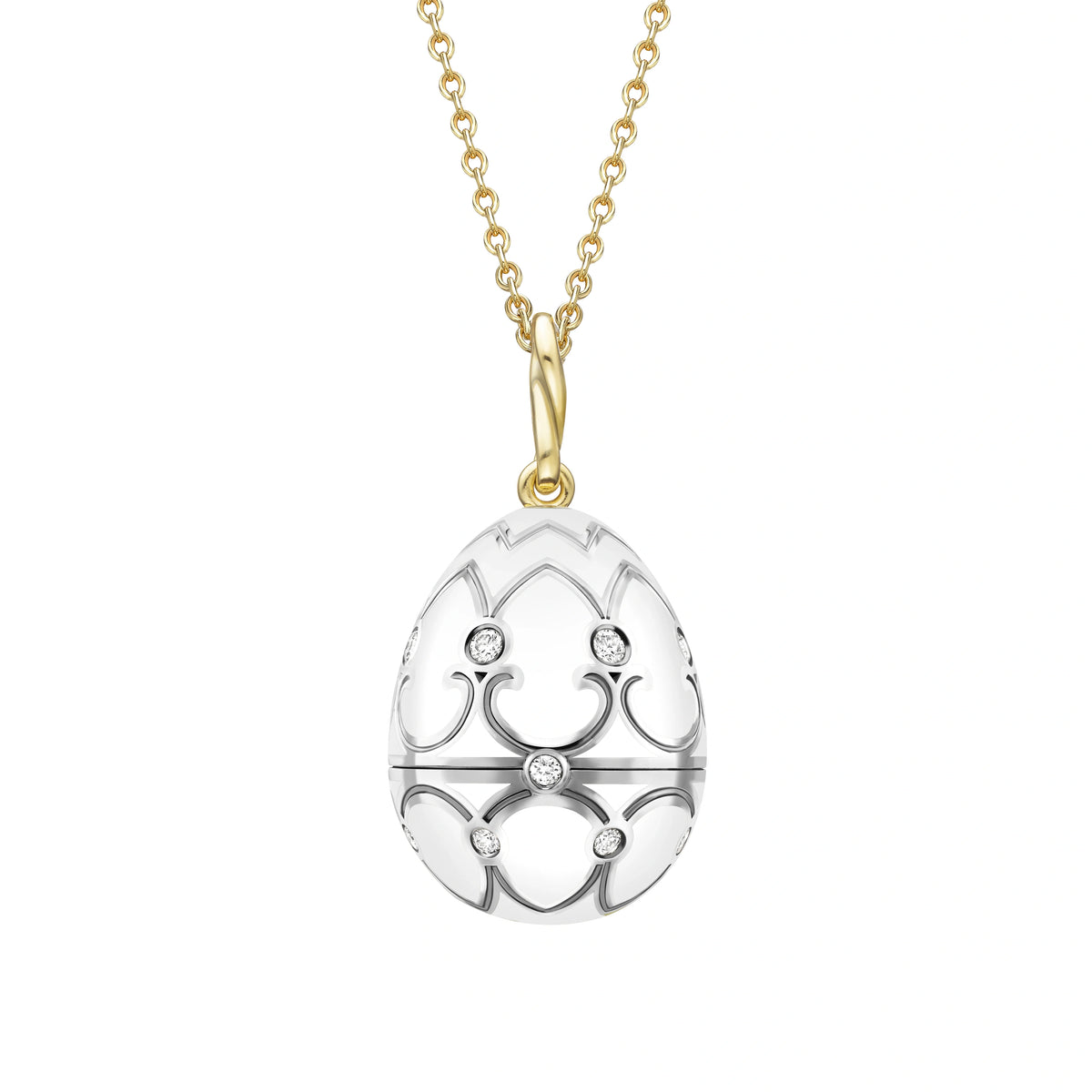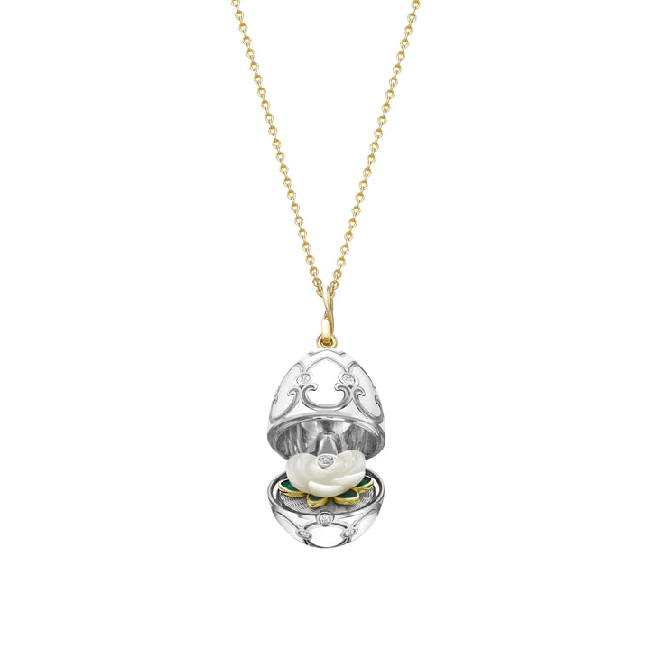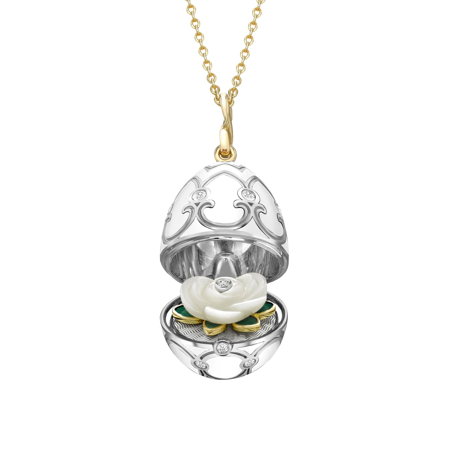 This Heritage Yellow and White Gold Diamond and Enamel Carved Mother of Pearl Rose Surprise Locket is a truly exquisite piece, showcasing Fabergé’s love for intricate design and luxurious detail. The 18k yellow gold bail and chain elegantly hold a white gold locket, which is adorned with 16 round brilliant-cut white diamonds. One of the diamonds forms the heart of a delicately carved mother of pearl rose, set atop green enamelled leaves and framed by 18k gold accents. This unique piece is a perfect blend of traditional and contemporary elements, symbolizing beauty, love, and surprise.